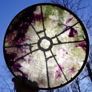 Being environmentally friendly and ethical, we source our materials locally from known and responsible suppliers. The frame is made of double-layered birch plywood which has been waxed with wood wax. The drumhead is Finnish reindeer skin that is either dyed with water colour stain or left natural. There is a wooden handle attached behind the drum.