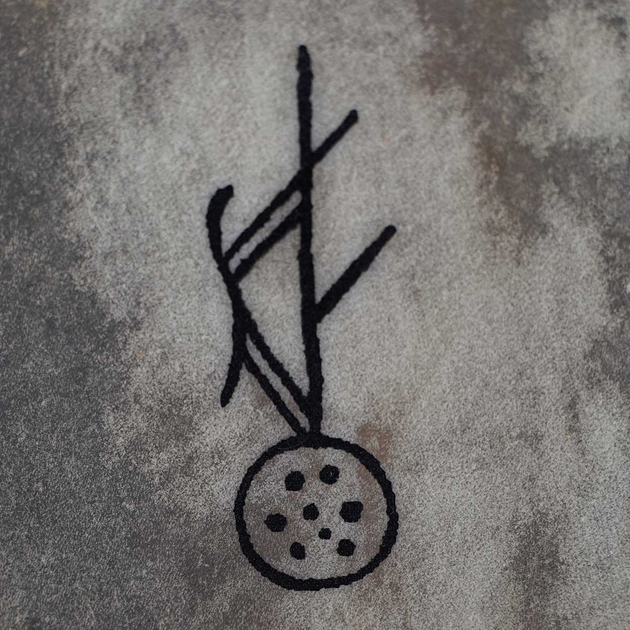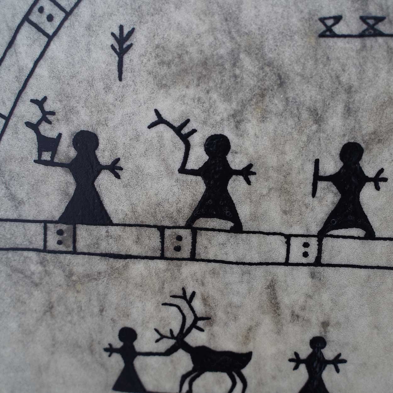 The picture on the drumhead has been hand-drawn. If you liked to add your own symbols or colour, you can use acrylic- or oil colours (please test first on a small area). You can also attach talismans on the frame or carve symbols to it. The drumhead is greased straight after we have attached it to the frame, so that it does not rip. If you have concerns regarding adding paint on the skin, please contact us to check whether the skin is suitable for painting.