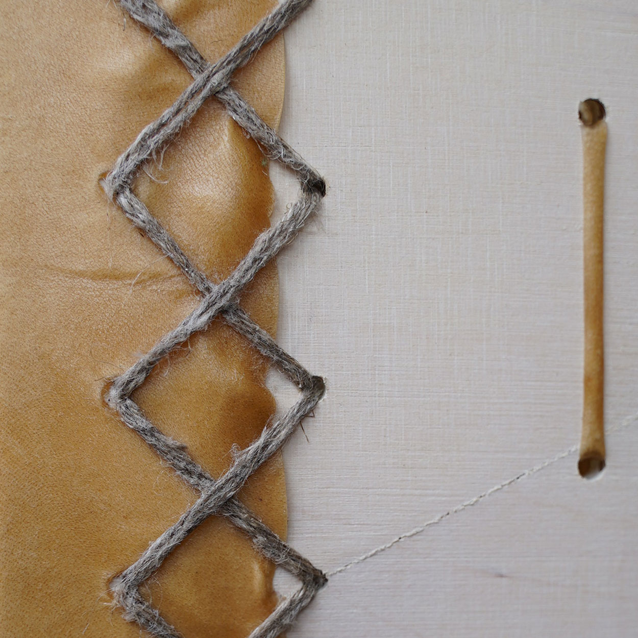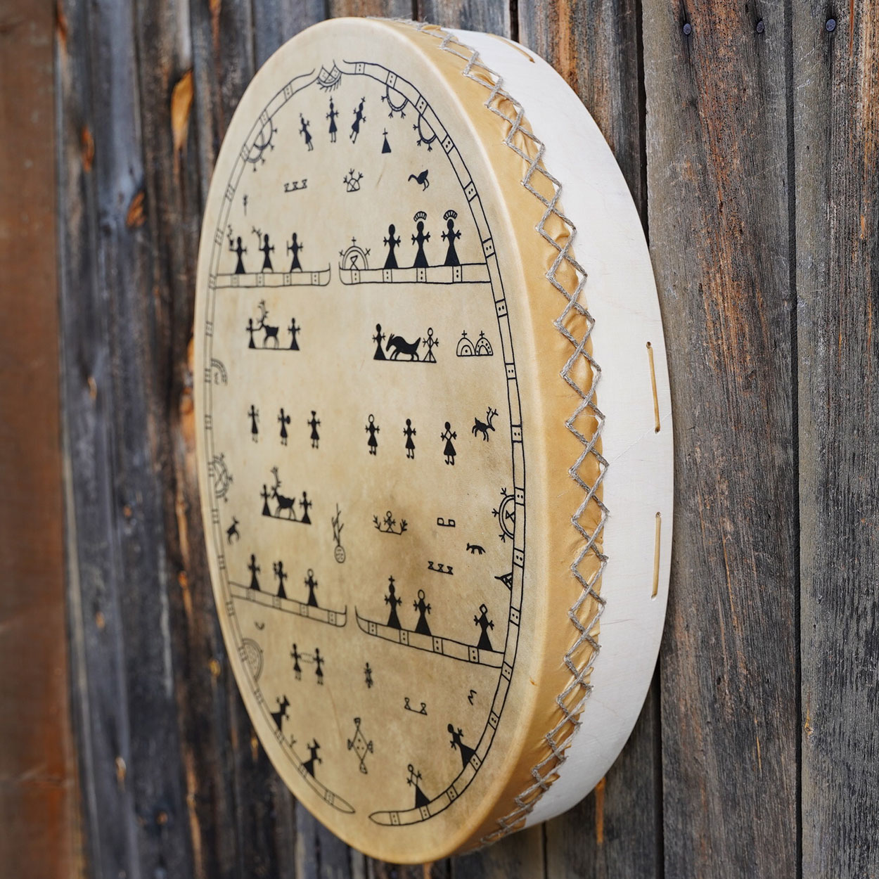 Being environmentally friendly and ethical, we source our materials locally from known and responsible suppliers. The frame is made of double-layered birch plywood which has been waxed with wood wax. The drumhead is Finnish reindeer skin that is left undyed with hand-drawn shamanic symbols on the top. A wooden handle is attached behind the drum.
