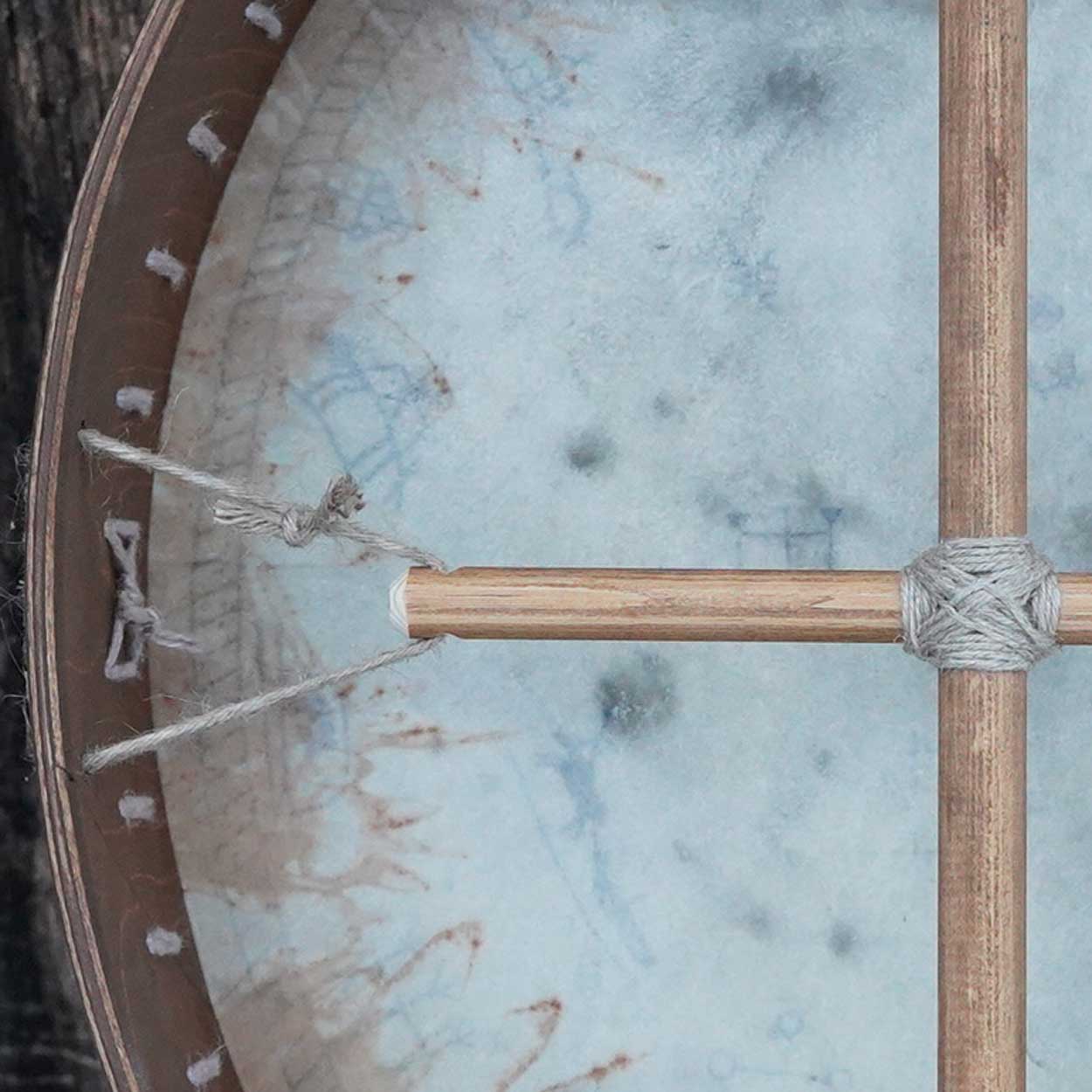 The picture on the drumhead has been hand-drawn. If you liked to add your own symbols or colour, you can use acrylic- or oil colours (please test first on a small area). You can also attach talismans on the frame or carve symbols to it. The drumhead is greased straight after we have attached it to the frame, so that it does not rip. If you have concerns regarding adding paint on the skin, please contact us to check whether the skin is suitable for painting.