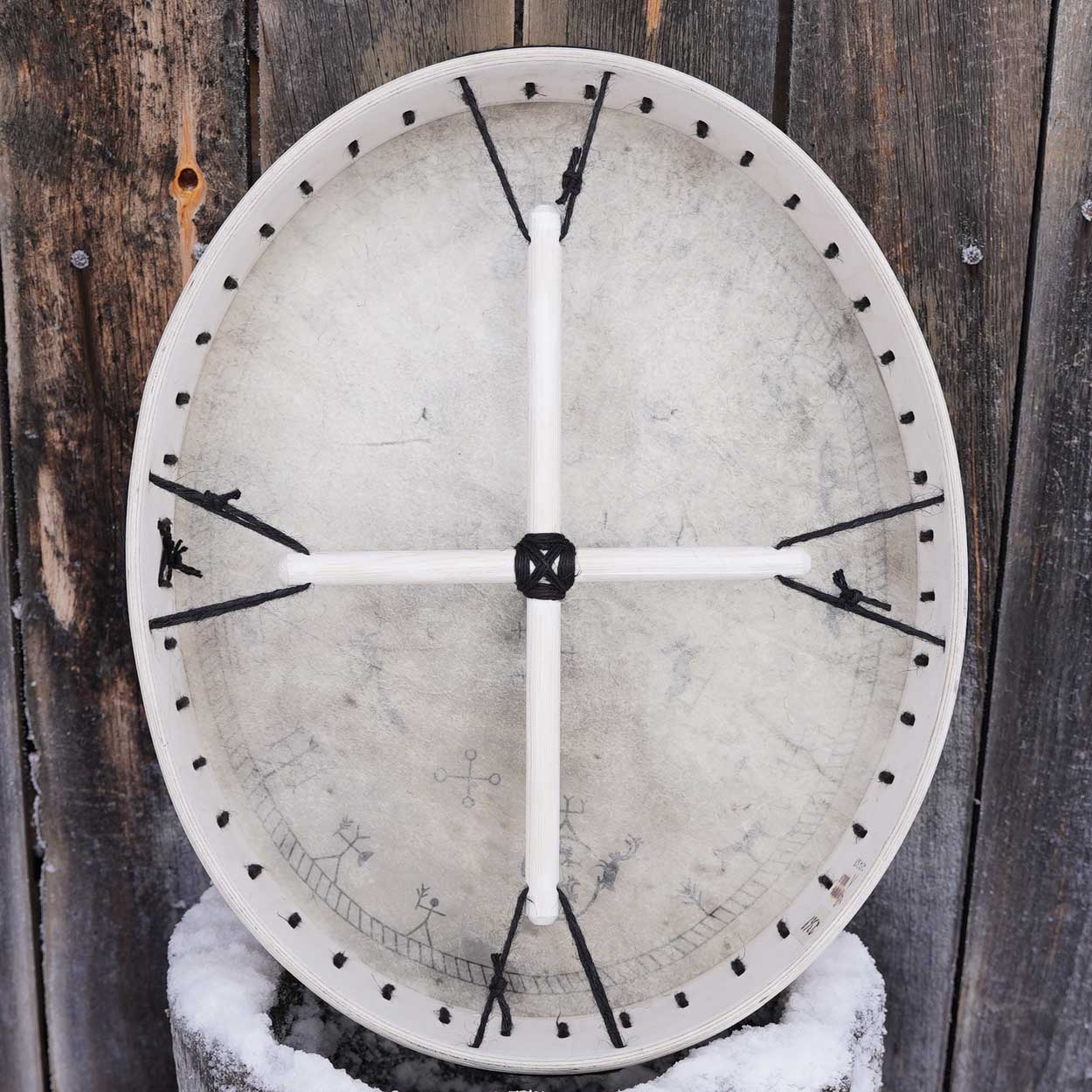 Being environmentally friendly and ethical, we source our materials locally from known and responsible suppliers. The frame is made of double-layered birch plywood which has been waxed with wood wax. The drumhead is Finnish reindeer skin that is left undyed with hand-drawn shamanic symbols on the top. There is a wooden handle attached behind the drum.