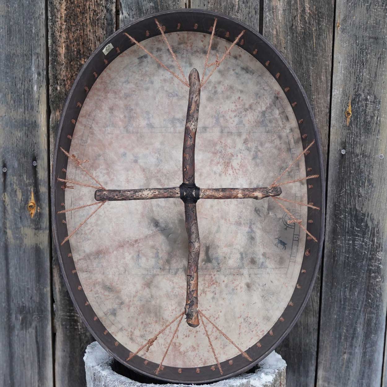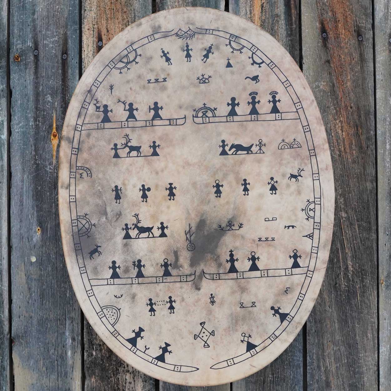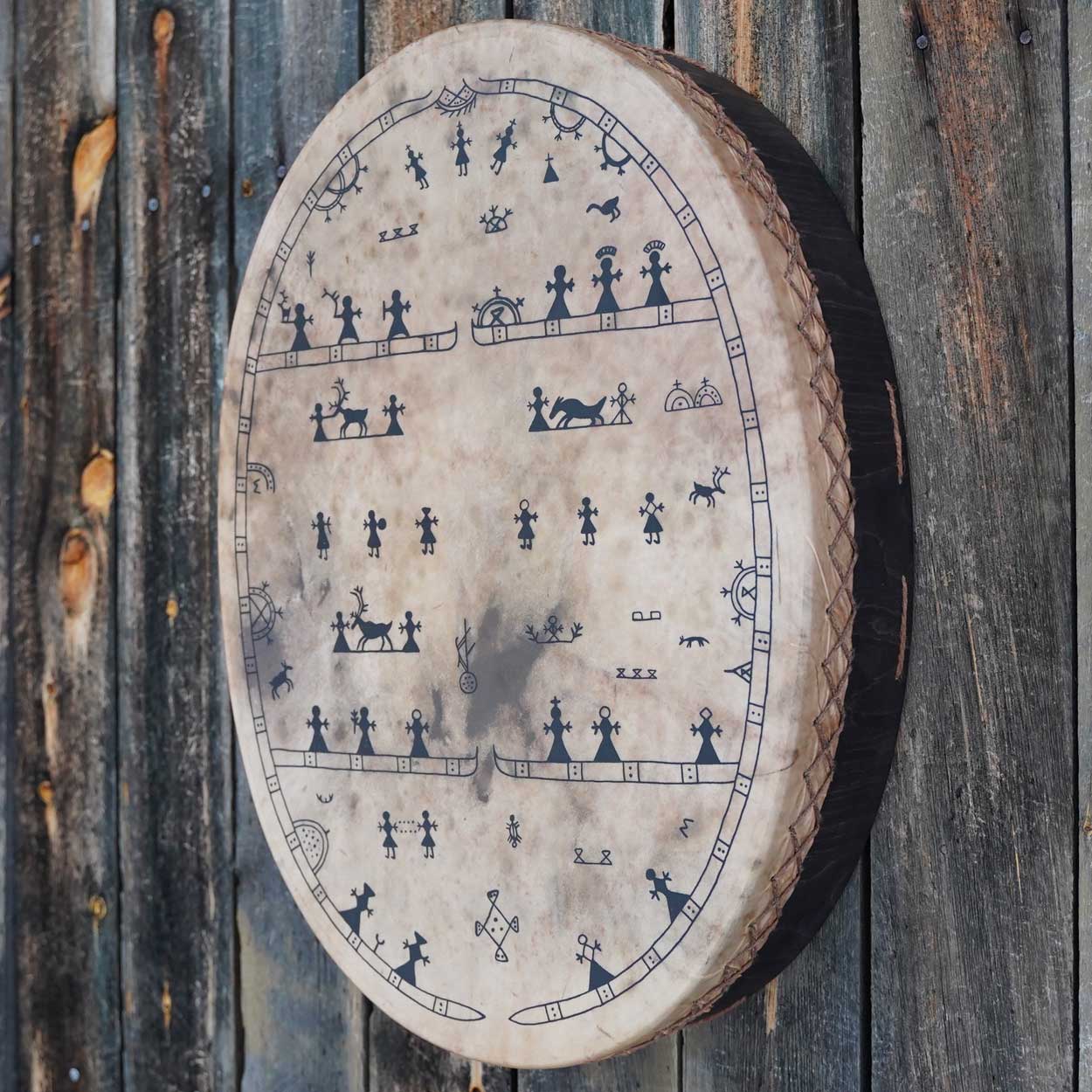 A beautiful and unique Sami drum that was handcrafted with love and care in our workshop in Finnish Lapland. This massive instrument has an amazing, low sound with powerful vibrations that you can feel in every cell.