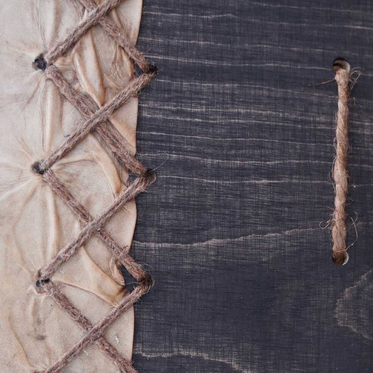 The picture on the drumhead has been hand-drawn. If you liked to add your own symbols or colour, you can use acrylic- or oil colours (please test first on a small area). You can also attach talismans on the frame or carve symbols to it. The drumhead is greased straight after we have attached it to the frame, so that it does not rip. If you have concerns regarding adding paint on the skin, please contact us to check whether the skin is suitable for painting.