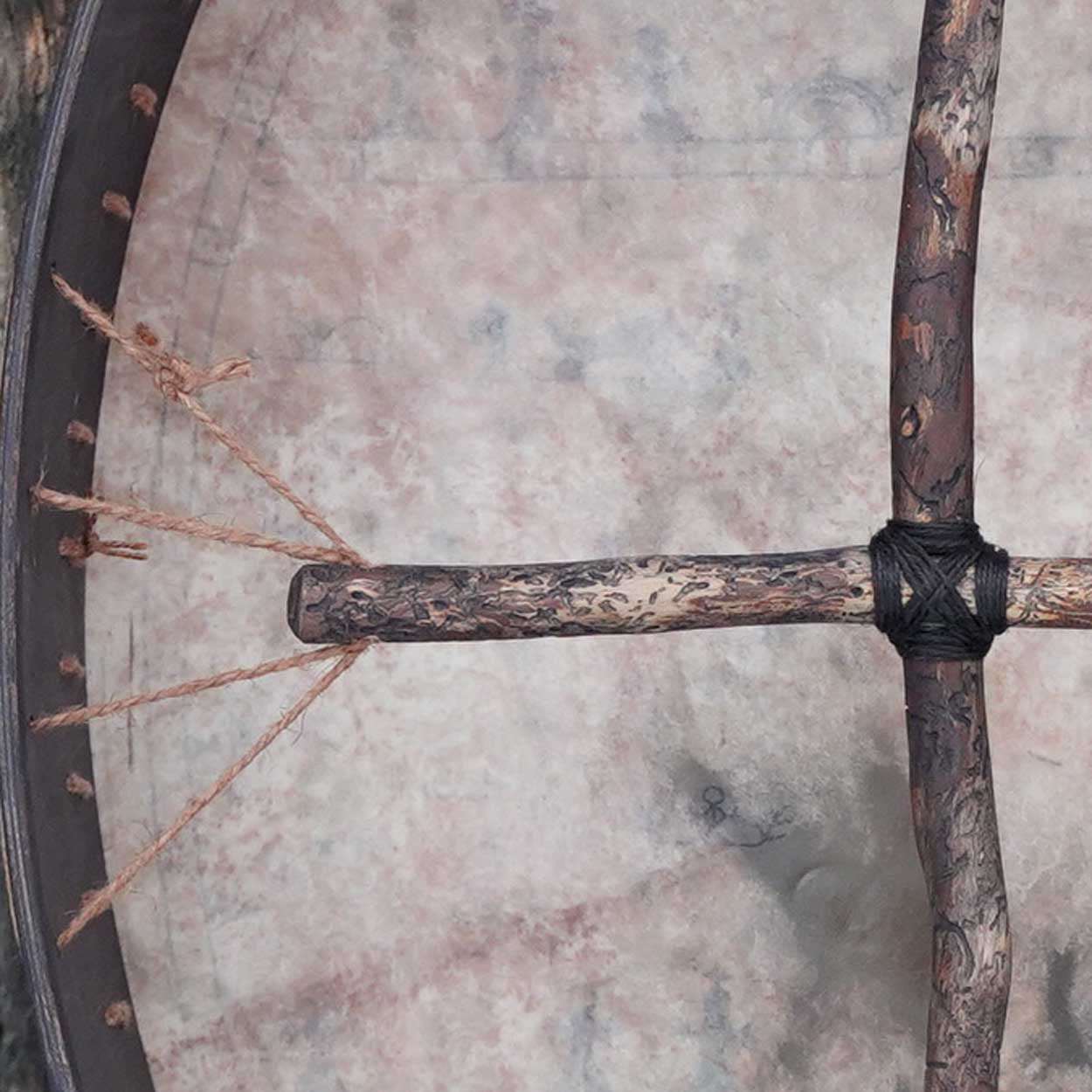Being environmentally friendly and ethical, we source our materials locally from known and responsible suppliers. The frame is made of double-layered birch plywood which has been waxed with wood wax. The drumhead is Finnish reindeer skin that is left undyed with hand-drawn shamanic symbols on the top. A wooden handle is attached behind the drum.