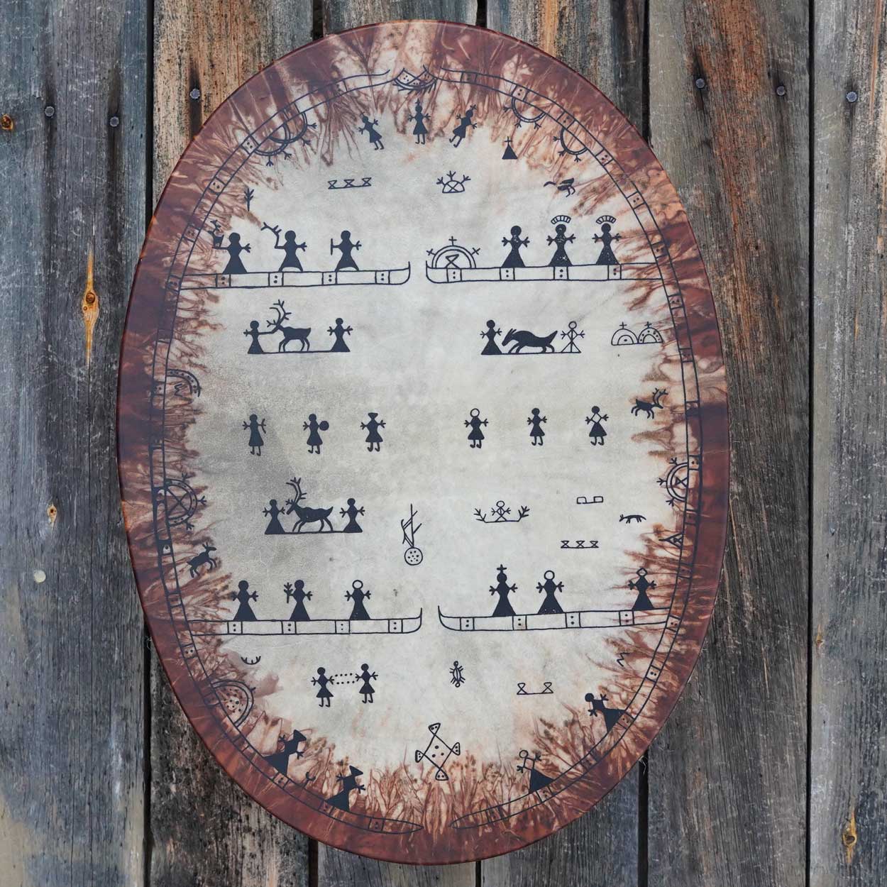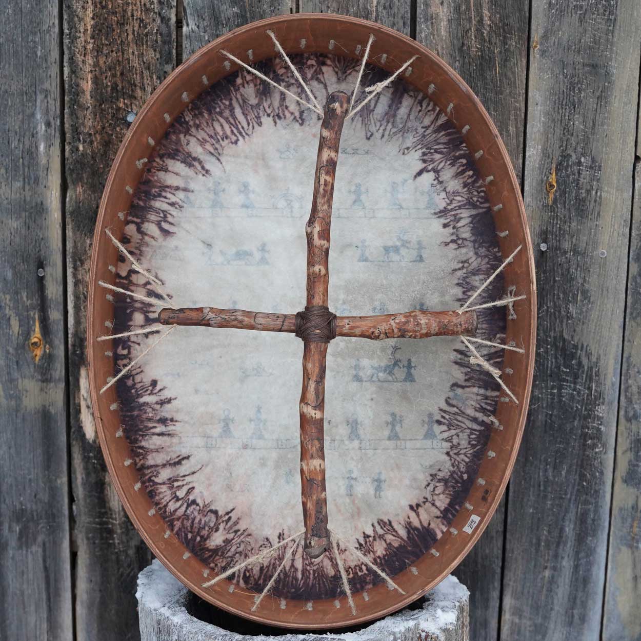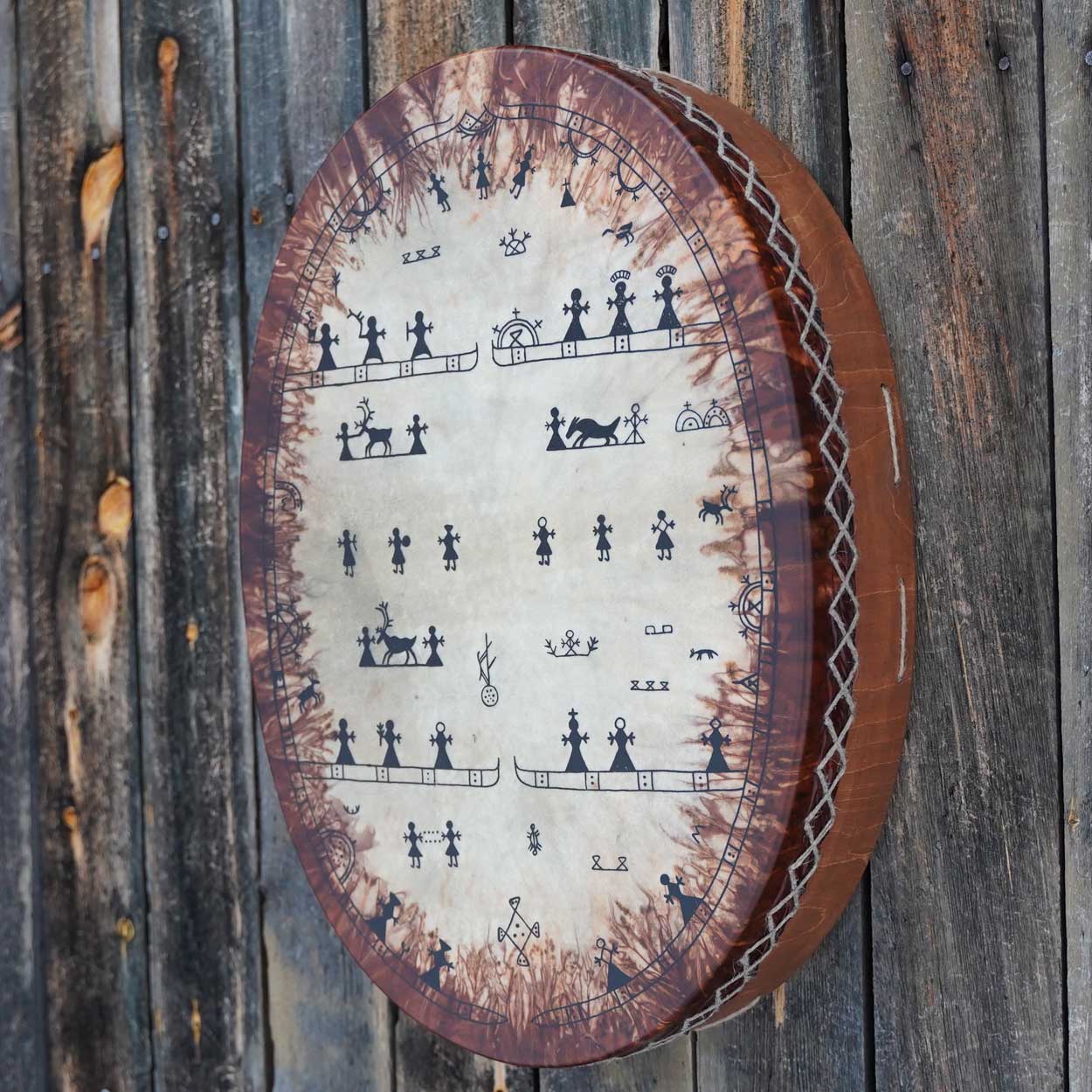 A beautiful and unique Sami drum that was handcrafted with love and care in our workshop in Finnish Lapland. This massive instrument has an amazing, low sound with powerful vibrations that you can feel in every cell.