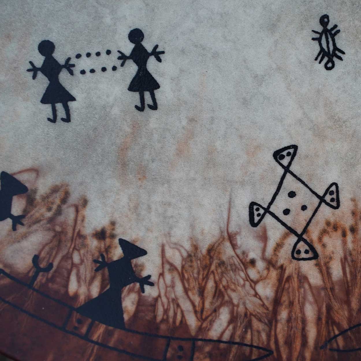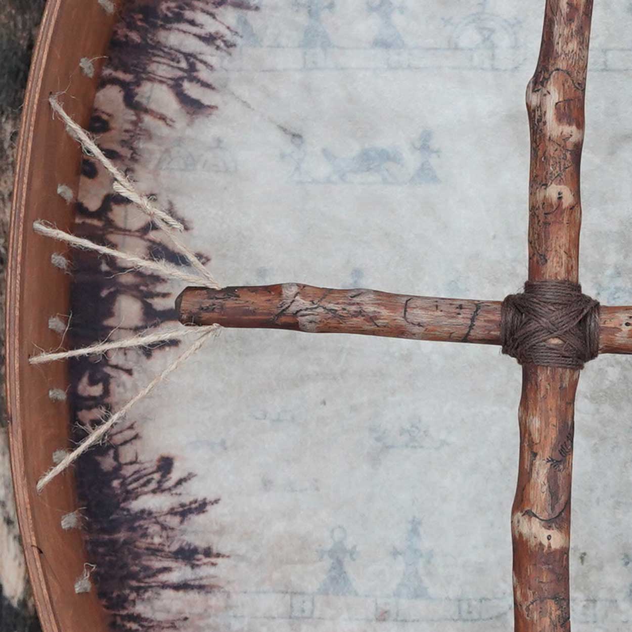 The picture on the drumhead has been hand-drawn. If you liked to add your own symbols or colour, you can use acrylic- or oil colours (please test first on a small area). You can also attach talismans on the frame or carve symbols to it. The drumhead is greased straight after we have attached it to the frame, so that it does not rip. If you have concerns regarding adding paint on the skin, please contact us to check whether the skin is suitable for painting.