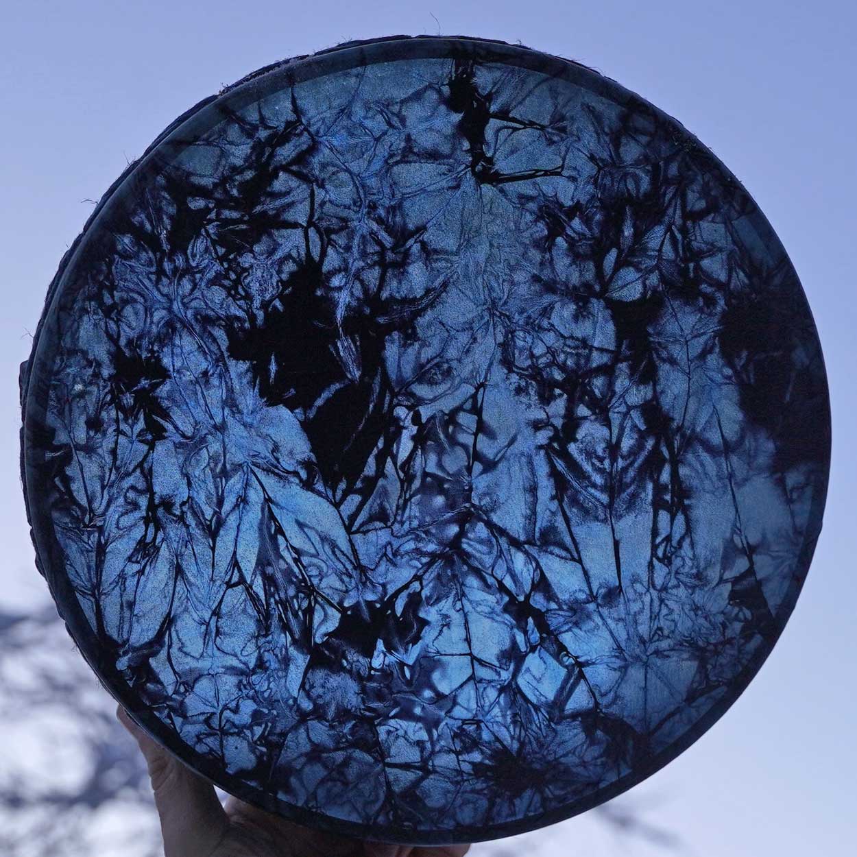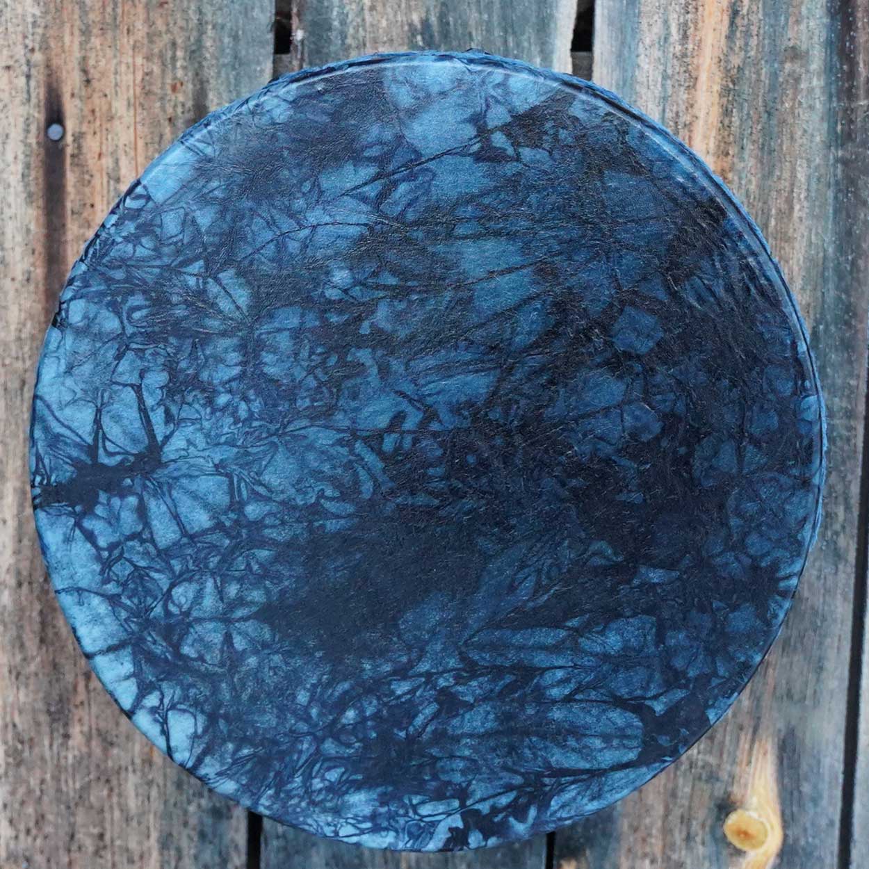 Being environmentally friendly and ethical, we source our materials locally from known and responsible suppliers. The frame is made of double-layered birch plywood which has been waxed with wood wax. The drumhead is Finnish reindeer skin that is either dyed with water colour stain or left natural. There is a wooden handle attached behind the drum.