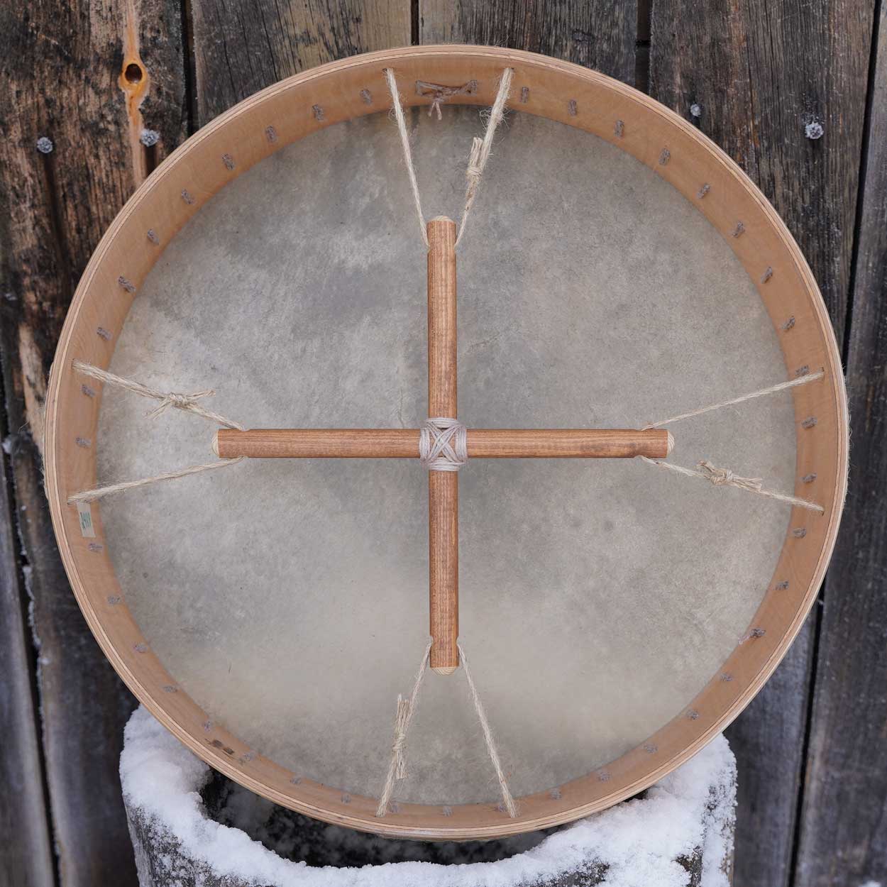 Being environmentally friendly and ethical, we source our materials locally from known and responsible suppliers. The frame is made of double-layered birch plywood which has been waxed with wood wax. The drumhead is Finnish reindeer skin that is either dyed with water colour stain or left natural. There is a wooden handle attached behind the drum.