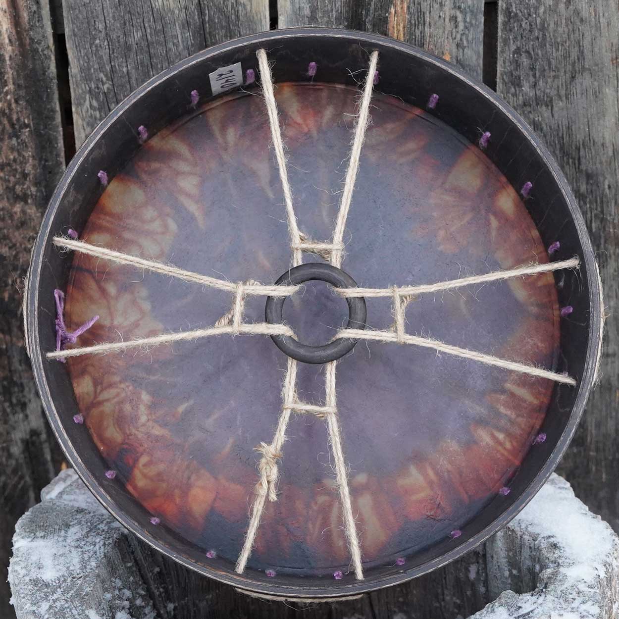 Being environmentally friendly and ethical, we source our materials locally from known and responsible suppliers. The frame is made of double-layered birch plywood which has been waxed with wood wax. The drumhead is Finnish reindeer skin that is either dyed with water colour stain or left natural. There is a wooden handle attached behind the drum.