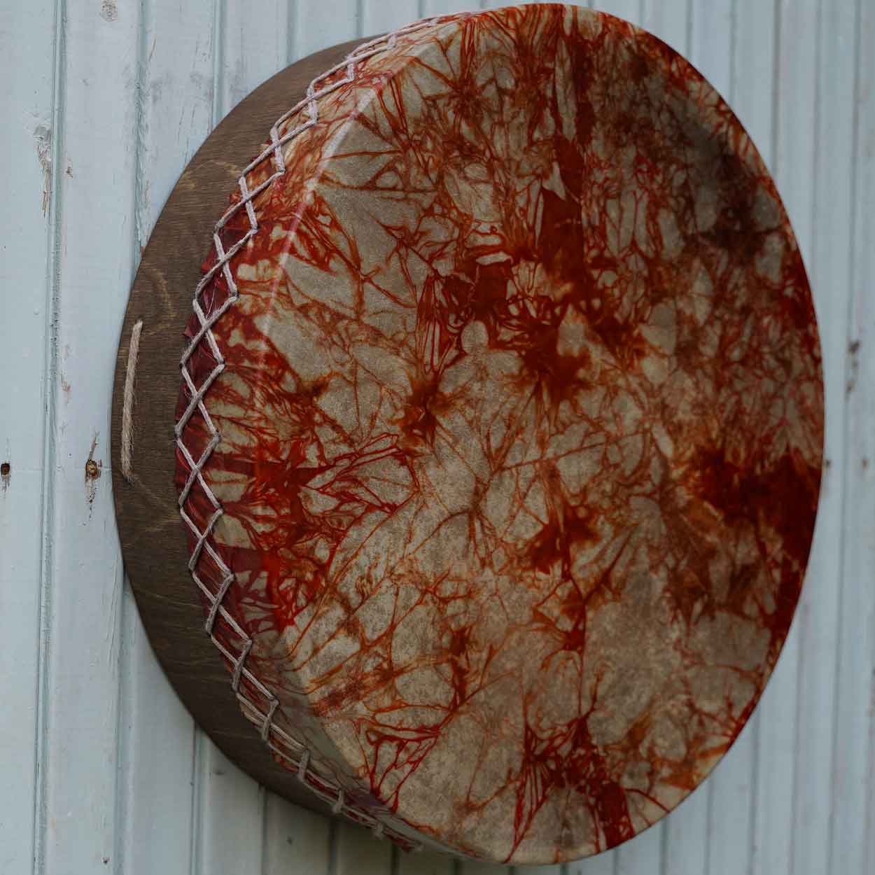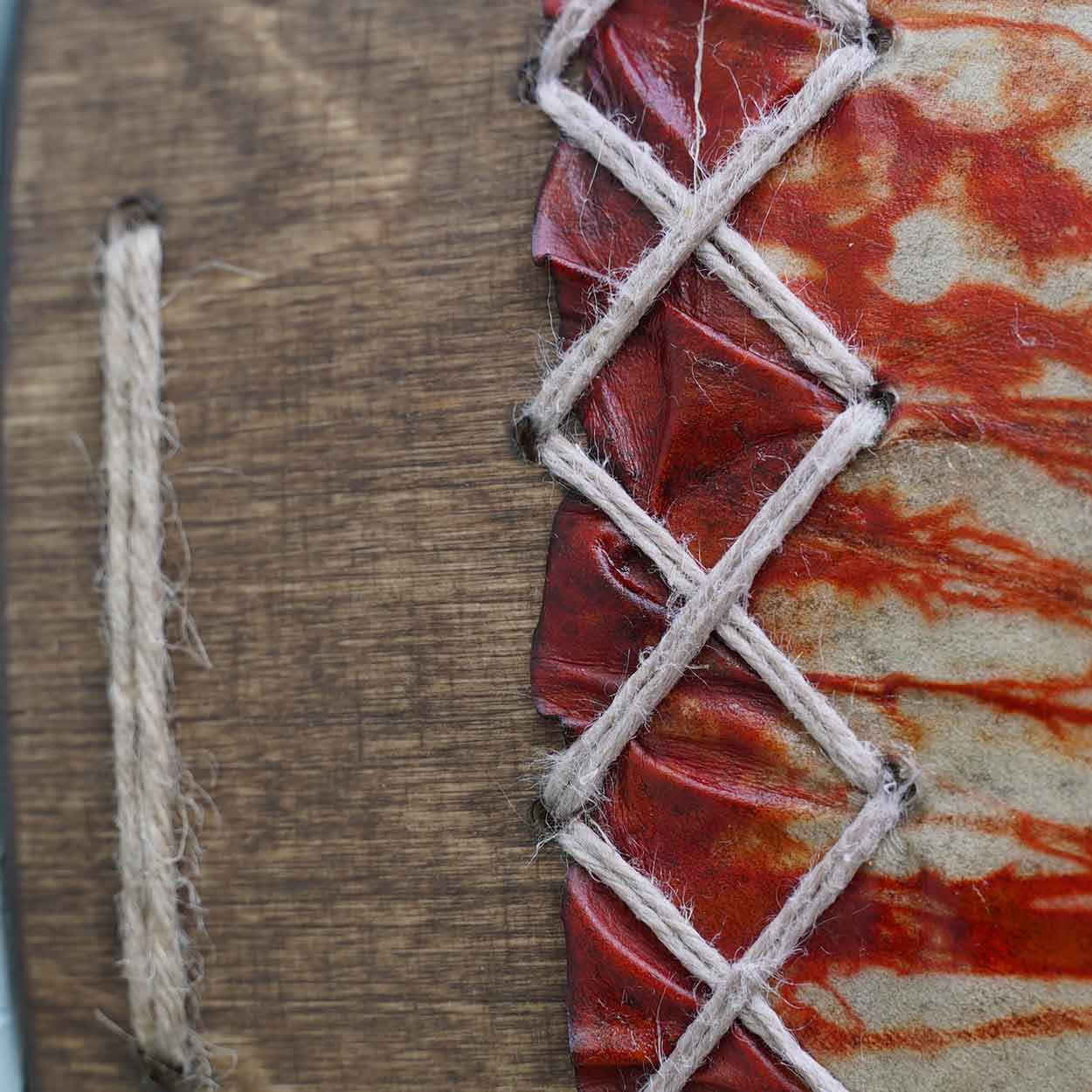 Being environmentally friendly and ethical, we source our materials locally from known and responsible suppliers. The frame is made of double-layered birch plywood which has been waxed with wood wax. The drumhead is Finnish reindeer skin that is either dyed with water colour stain or left natural. There is a wooden handle attached behind the drum.