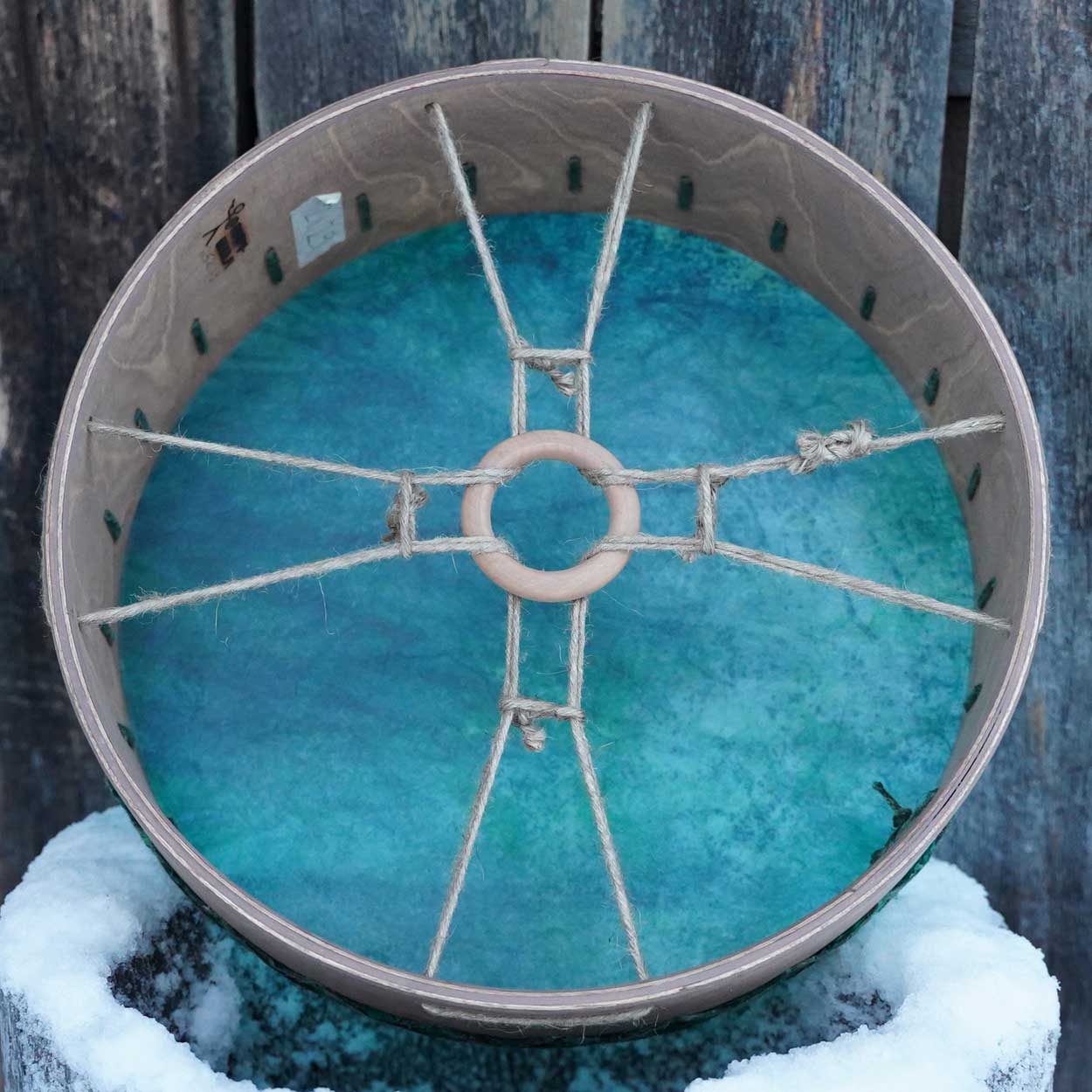 Being environmentally friendly and ethical, we source our materials locally from known and responsible suppliers. The frame is made of double-layered birch plywood which has been waxed with wood wax. The drumhead is Finnish reindeer skin that is either dyed with water colour stain or left natural. There is a wooden handle attached behind the drum.