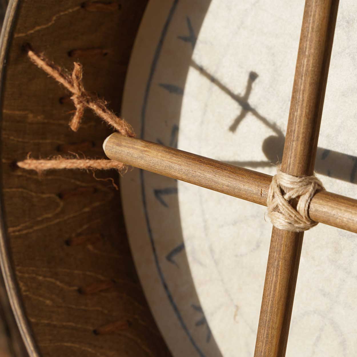 The drumhead is made of Finnish reindeer skin and the symbols have been added using silk printing. A wooden handle is attached to the back with strings.