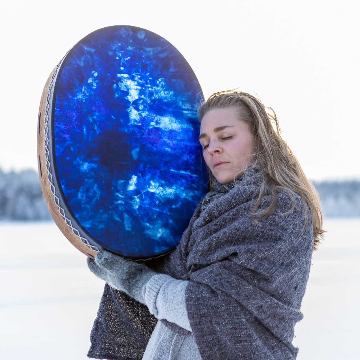 Kurssilla teemme noin 40 cm:n halkaisijan rummun (M koko). Kehikko on koivuvaneria ja nahka kotimaista poronnahkaa. Rumpukalvo värjätään vesipetsillä, tai voit myös itse maalata siihen haluamasi kuvan.