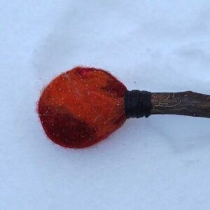 Soma soittokapula, jonka pää on huovutettua villaa. Kapulan puuosa on tiheäsyistä kuusta, joka on sahattu, vuoltu ja hiottu. Harmaa-punainen villapää on pesukoneessa huovutettu. Poronnahkainen nauha koristaa vartta.