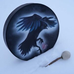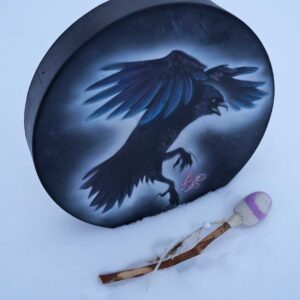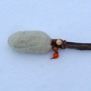 Hempeän vaalensininen lampaanvilla kera harmaan koristaa tätä käsintehtyä rumpukapulaa. Tämän kapulan puuosa on matosten kuvittamaa kuusta, joka on sahattu, vuoltu, hiottu ja suojattu tummaksi puuvahalla. Villainen pää on pesukoneessa huovutettu. Poronnahkainen nauha koristaa vartta.
