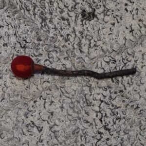 Iloisen punainen pesukonehuovutettu rumpukapula nyt tosi soittajalle. Tämän kapulan puuosa on matosten kuvittamaa kuusta, joka on sahattu, vuoltu, hiottu ja värjätty puuvahalla läpikuultavan mustaksi. Poronnahkainen nauha koristaa vartta.