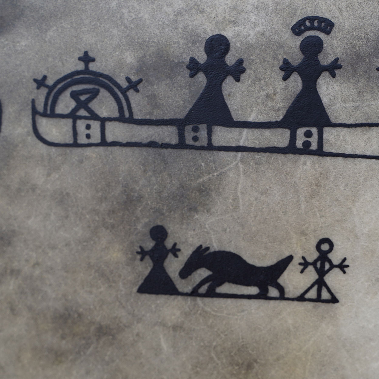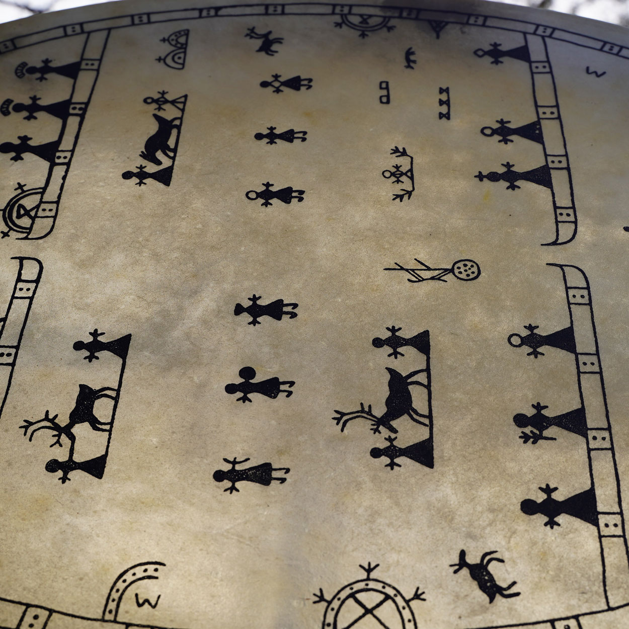 - Kotimaista poronnahkaa, päällä ikiaikaiset symbolit silkkipainolla