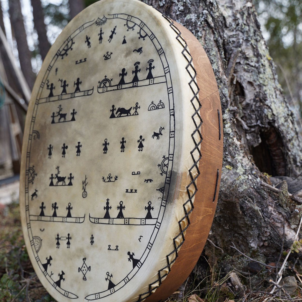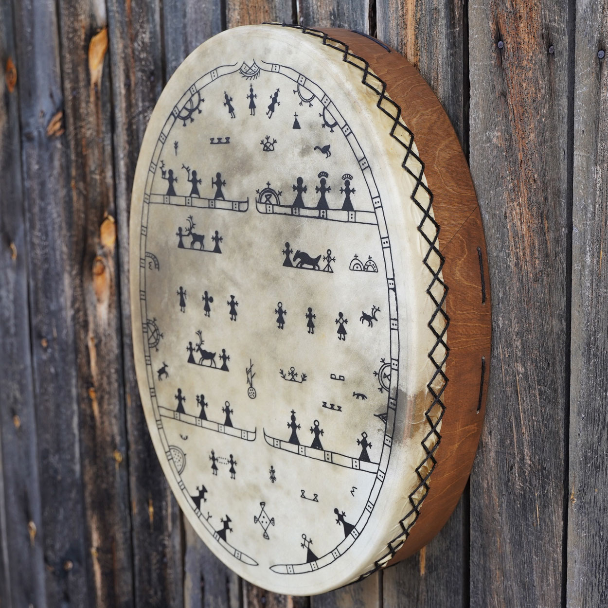 Muhkea ja mahtava – tämä on rumpujen rumpu! L-kokoinen lapinrumpu on tehty niille, jotka haluavat kokea mystisen maailman koko voimalla. Jyhkeä soundi värähtelee kehossa ja saa mielen hiljaiseksi – parhaimmillaan tämä rumpu on nuotion ääressä keskikesän yöttömässä yössä tai revontulten alla, kun maailma on täynnä magiaa.
