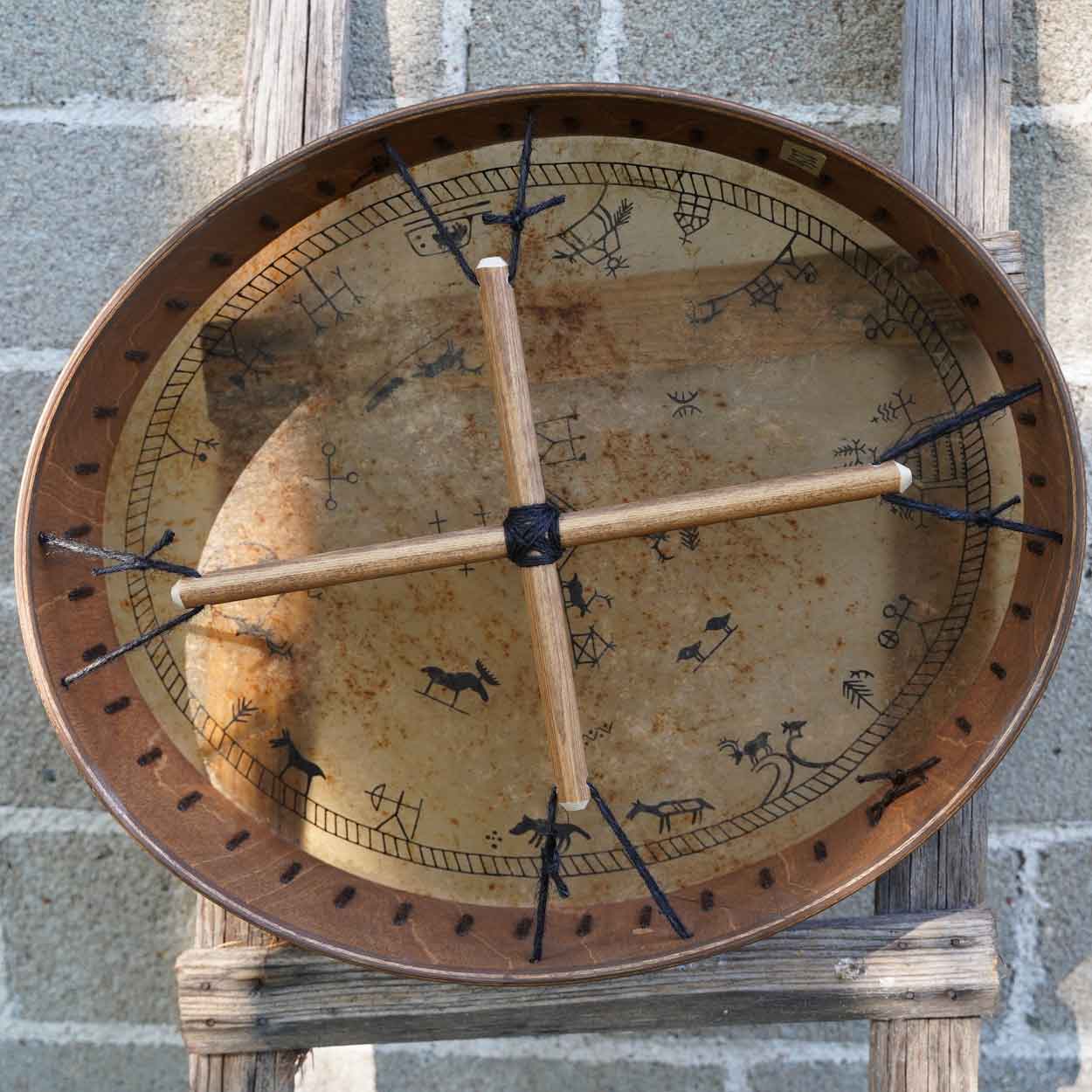 Koko: soikea shamaanirumpu 45×37 cm, reunan korkeus 10 cm.