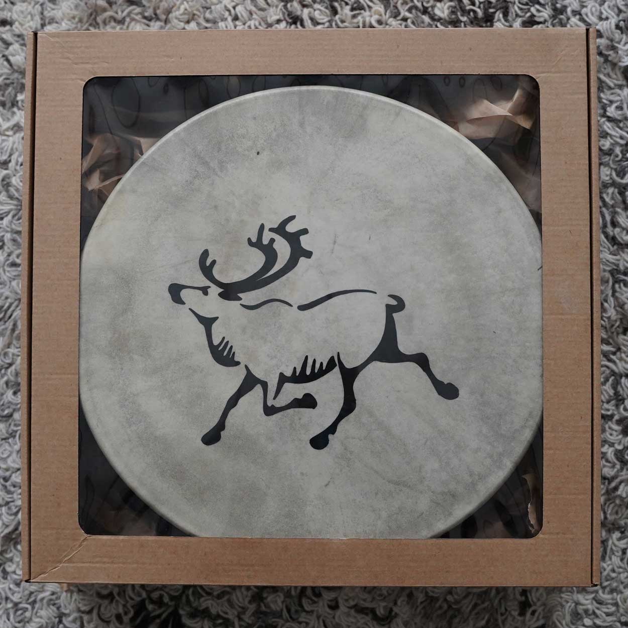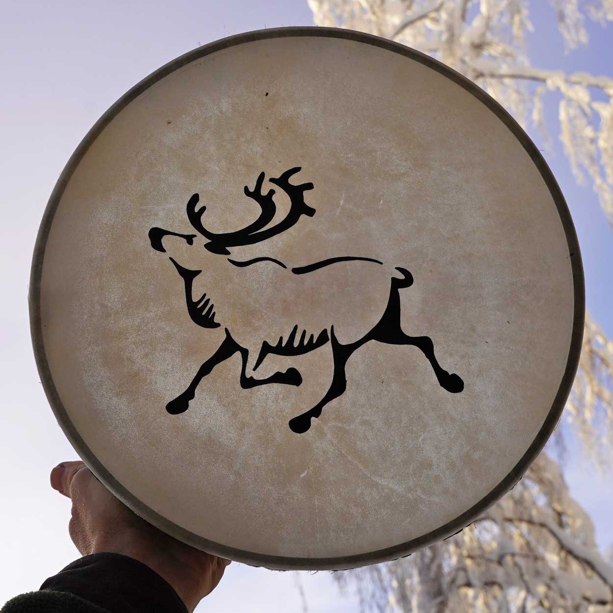 Rummun kalvoon on silkkipainolla painettu poro. Rumpu on pakattu kauniiseen lahjapakettiin. Rumpukapula kuuluu lapinrummun hintaan.