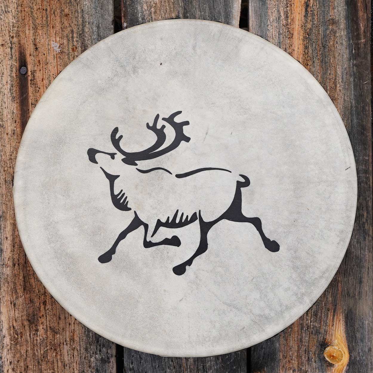 Ylväs Reima-poro askeltaa lapinrummun kalvossa. Tämä kaunis, pieni lapinrumpu tuo mystistä tunnelmaa ja on upea matkamuisto Lapin matkalta.