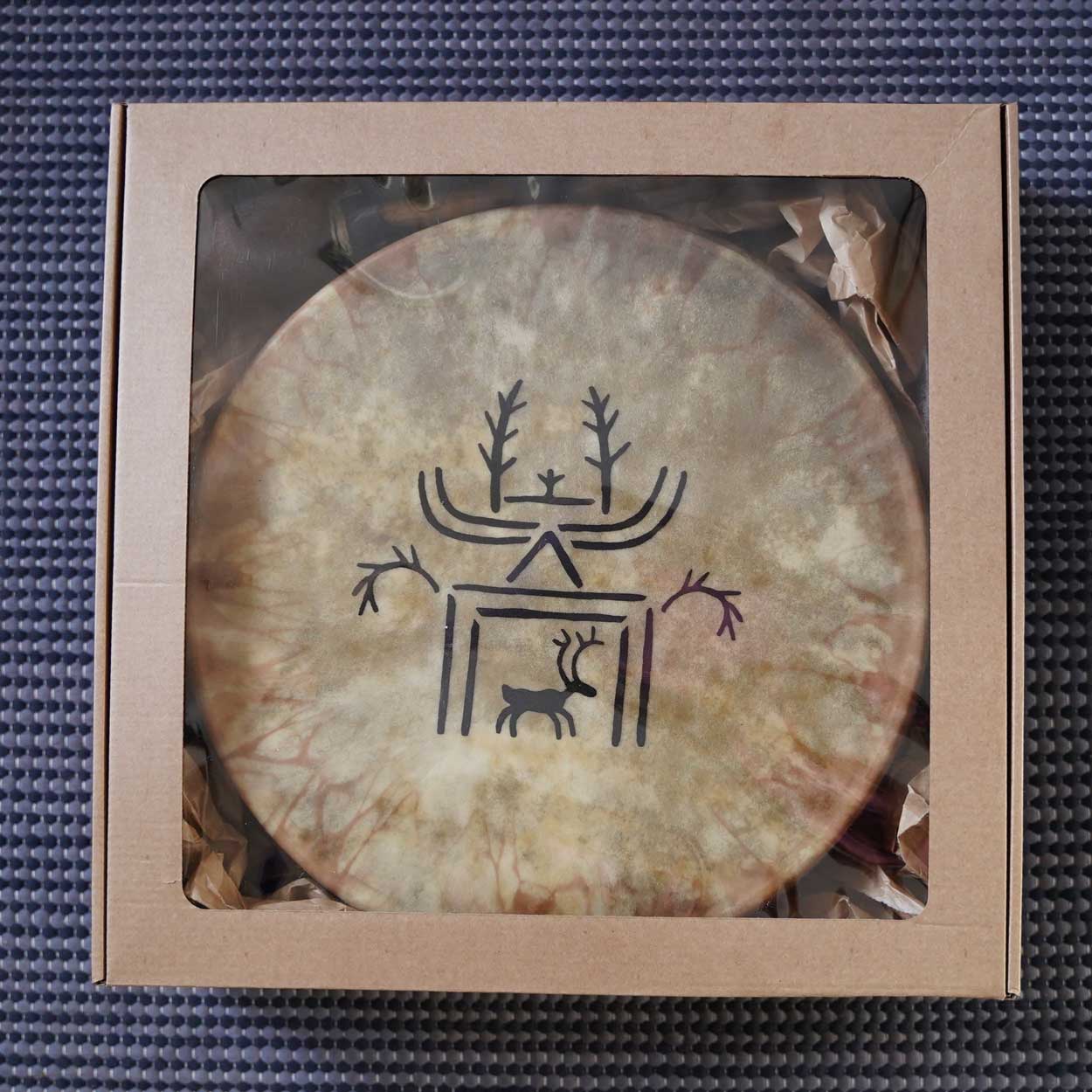 Koko: pyöreä lapinrumpu 31×31 cm, reunan korkeus 10 cm. Paino noin 0,450 kg.
