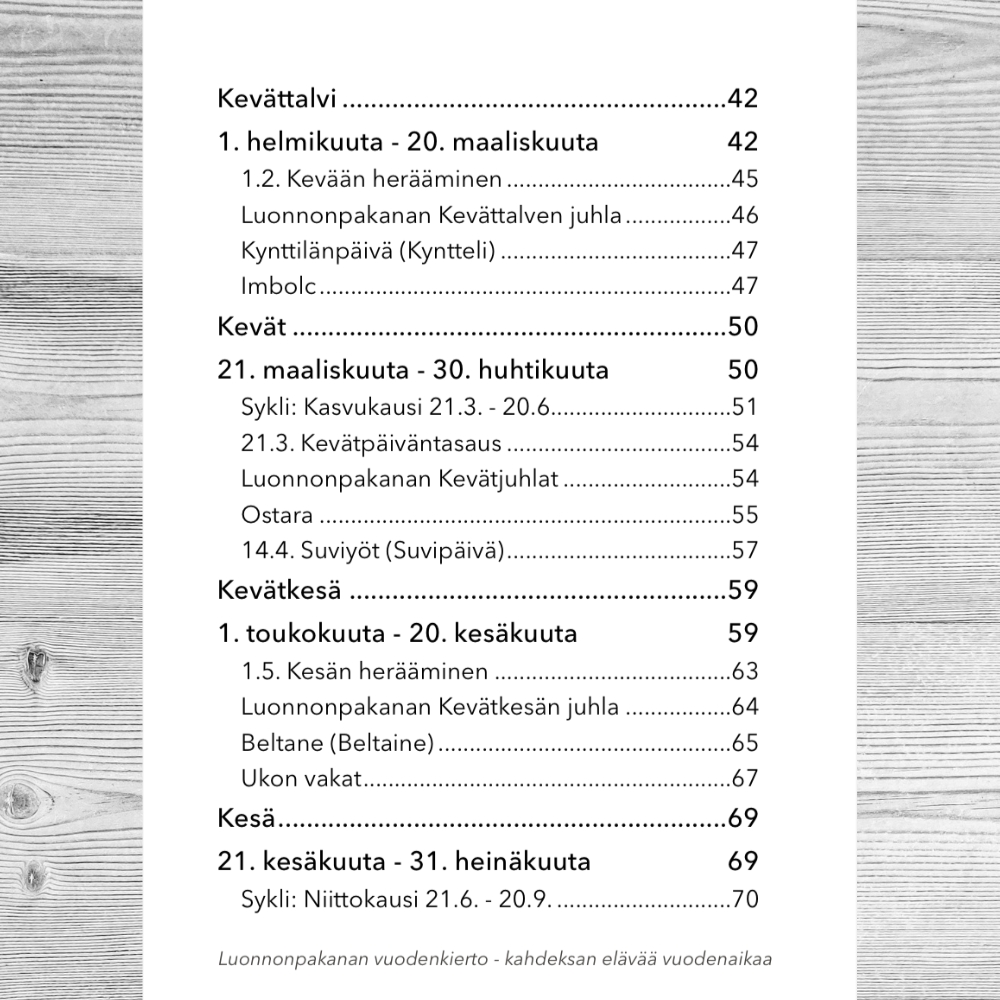 Luonnonpakanan vuodenkierto on luonnonkierrosta, sen erilaisista kausista sekä vanhoista luonnonpyhistä ammentava opas, joka johdattelee kokemaan vuodenajat ja niiden vaihtelut toisenlaisella kulmalla: elämänmenon tienviittana myös nykyihmiselle.