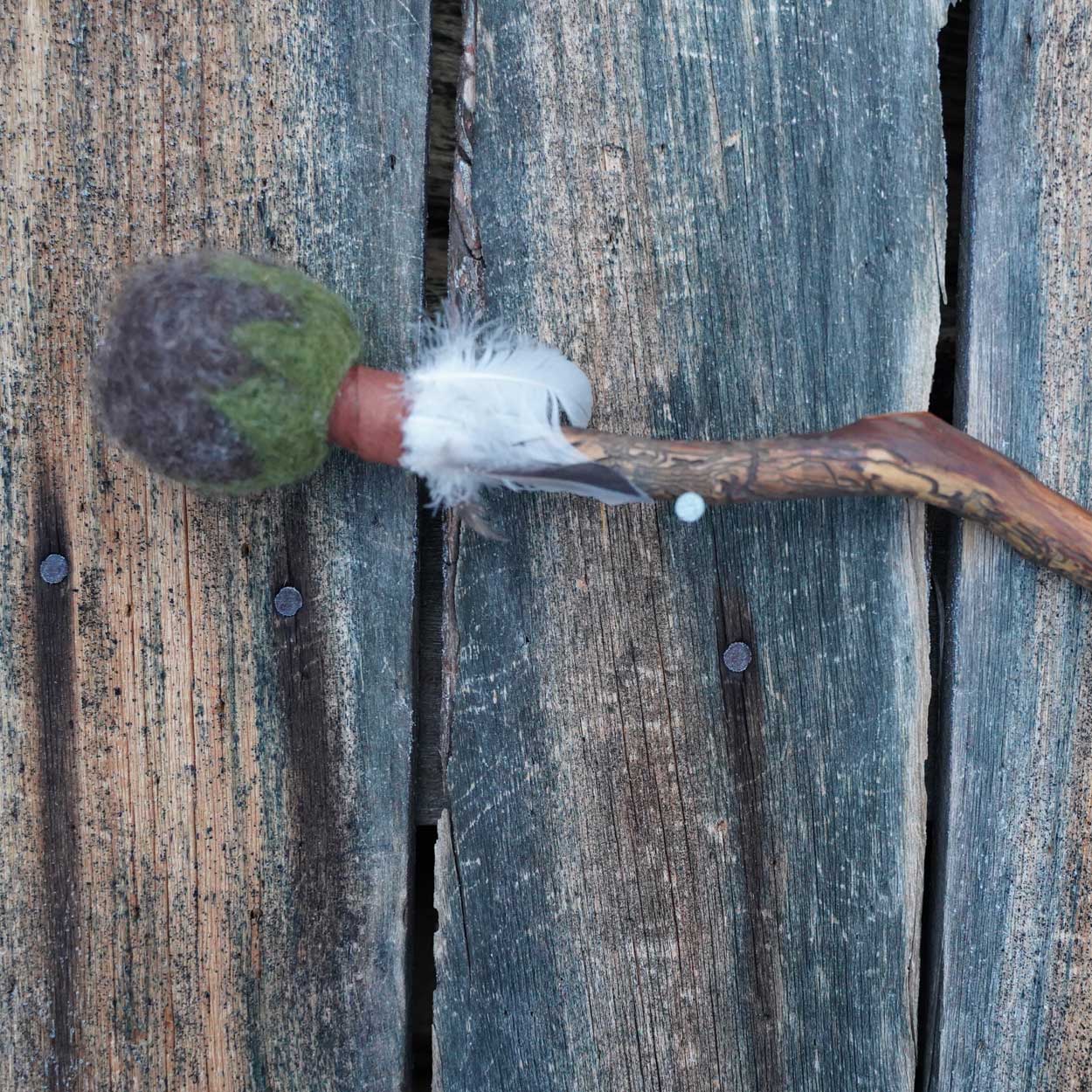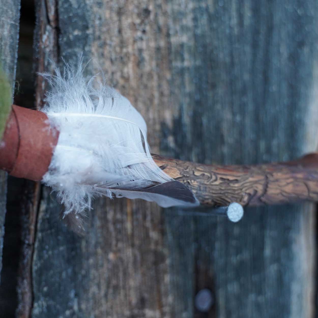 Suloiset, pienet höyhenet, jotka on itse kerätty metsästä, on liimattu poronnahkaisen vyötteen alle. Rumpukapulan pää on pesukoneessa huovutettua suomenlampaan villaa. Ruskeaksi värjätty puukapula on sahattu, vuoltu, hiottu, suojattu puuvahalla ja vielä maan matosten koristelema – tälläistä taidetta ei helposti löydä. Maanläheiset värit – ruskea ja sammalmetsän vihreä ovat ne valitut värit tähän kapulaan.