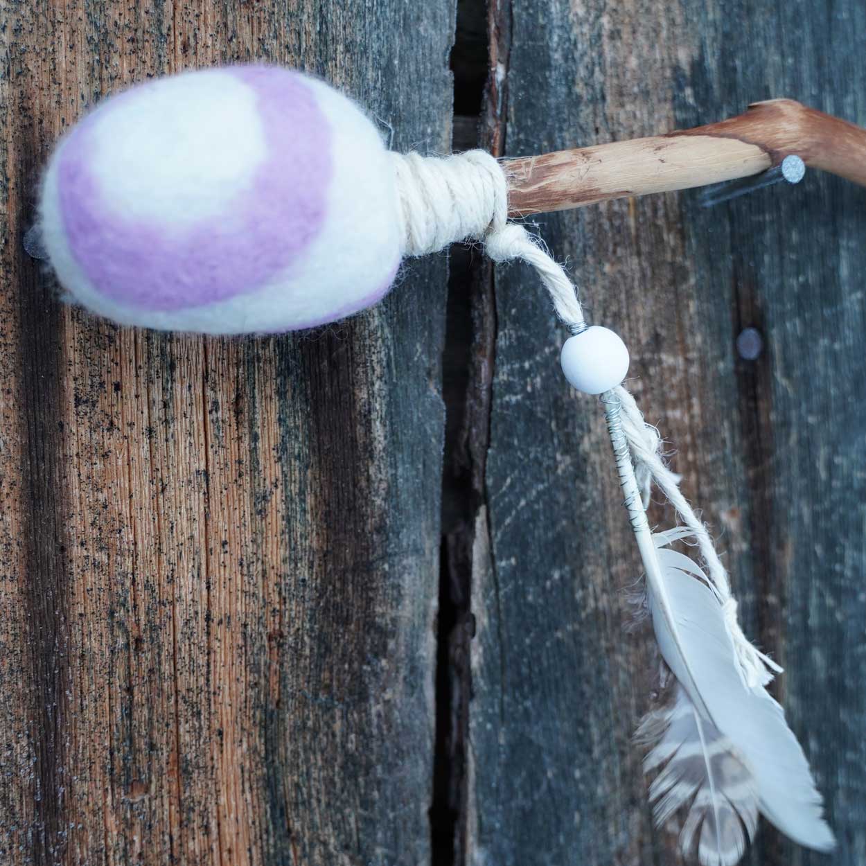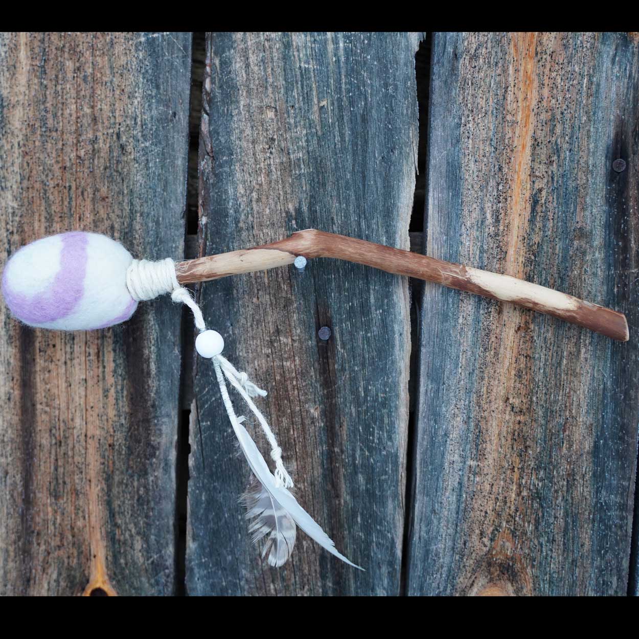 Herkänvärinen rumpukapula, jota (olettavasti) koristaa riekon talvi- ja kesäsulka yhden puuhelmen kera. Puuosa on kuusta, joka on sahattu, vuoltu, hiottu ja suojattu puuvahalla. Violetti-valkoinen villainen pää on pesukoneessa huovutettu.