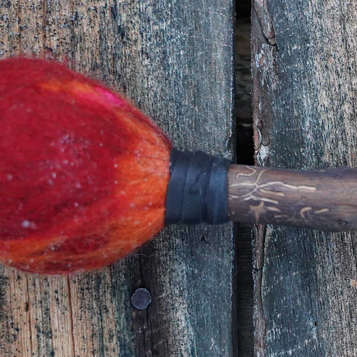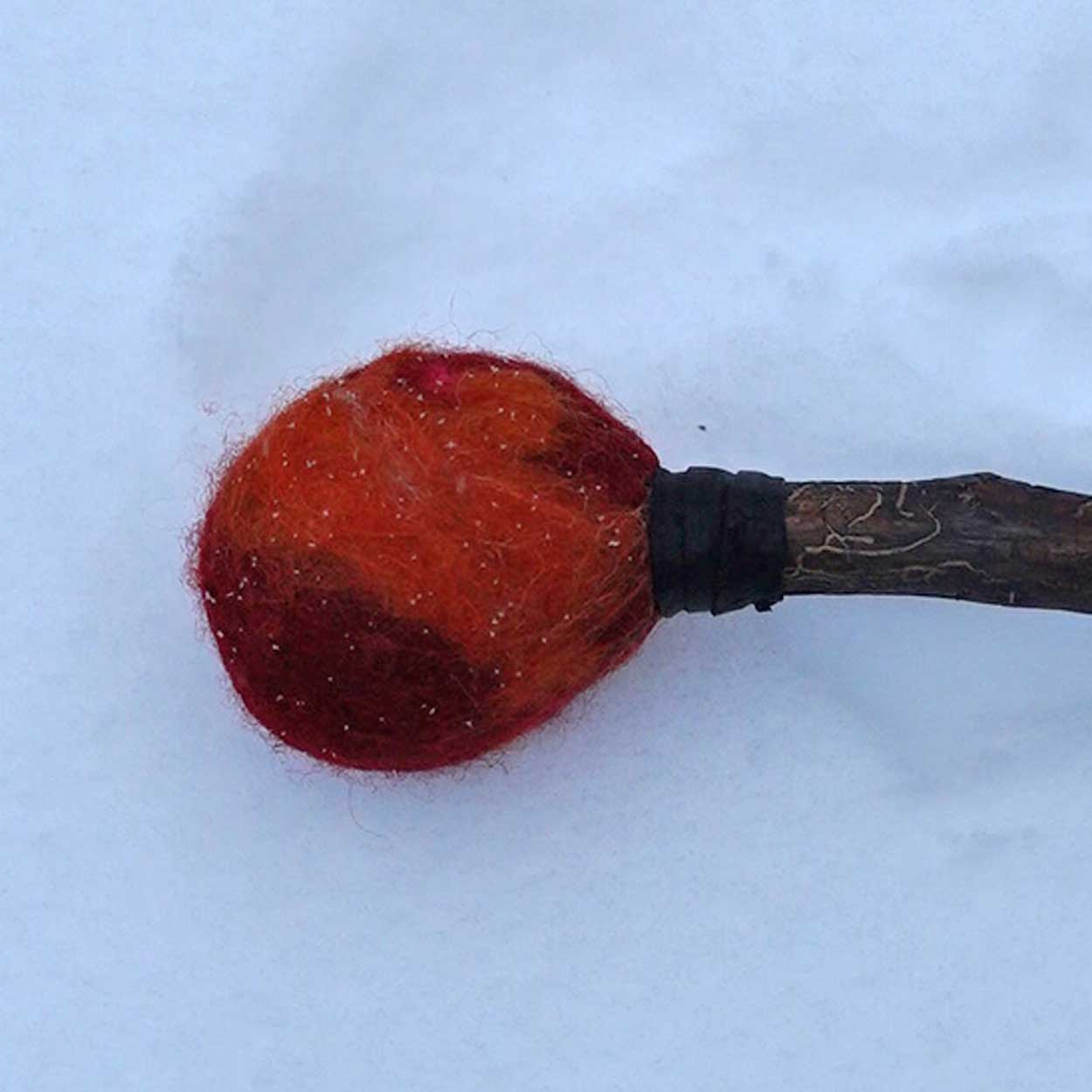 Tämän kapulan puuosa matosten kuvittamaa kuusta, joka on sahattu, vuoltu, hiottu ja suojattu puuvahalla. Puna-oranssi villainen pää on pesukoneessa huovutettu. Poronnahkainen nauha koristaa vartta.