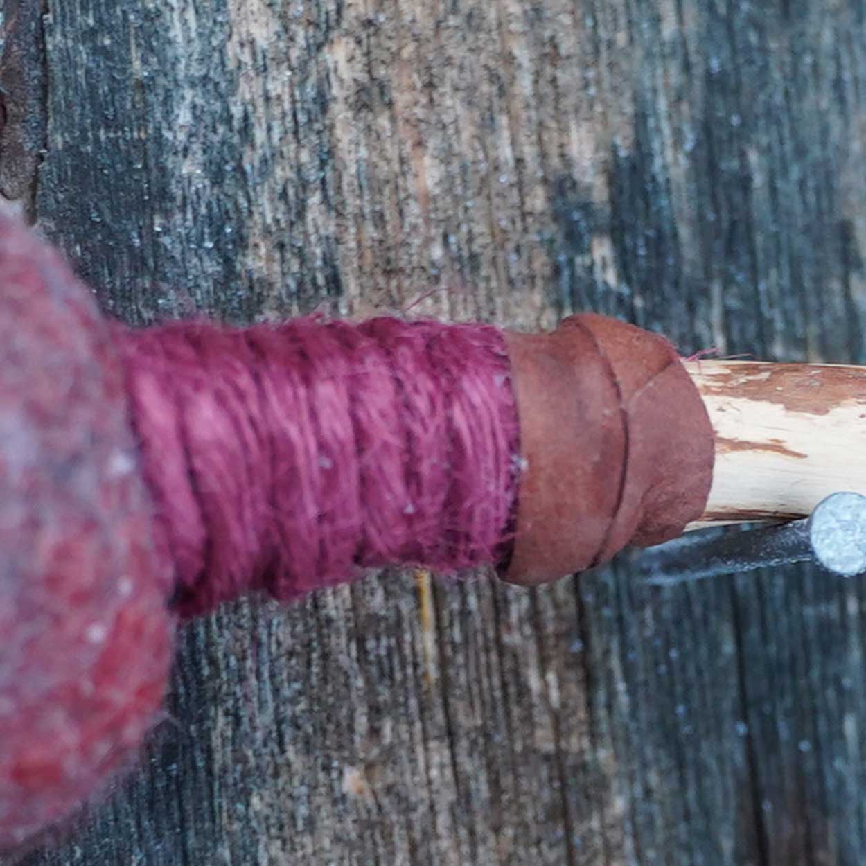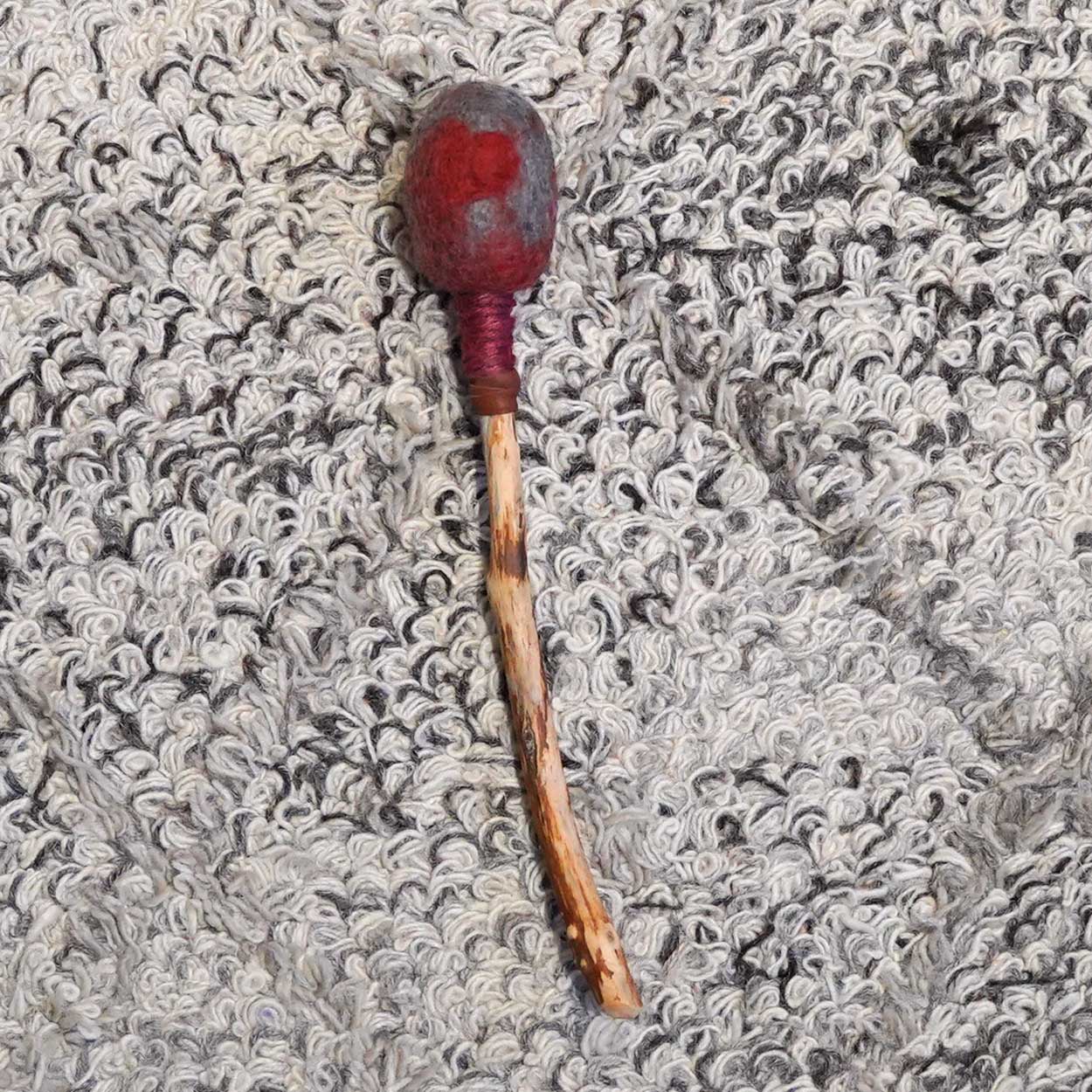 Soma soittokapula, jonka pää on huovutettua villaa. Kapulan puuosa on tiheäsyistä kuusta, joka on sahattu, vuoltu ja hiottu. Harmaa-punainen villapää on pesukoneessa huovutettu. Poronnahkainen nauha koristaa vartta.