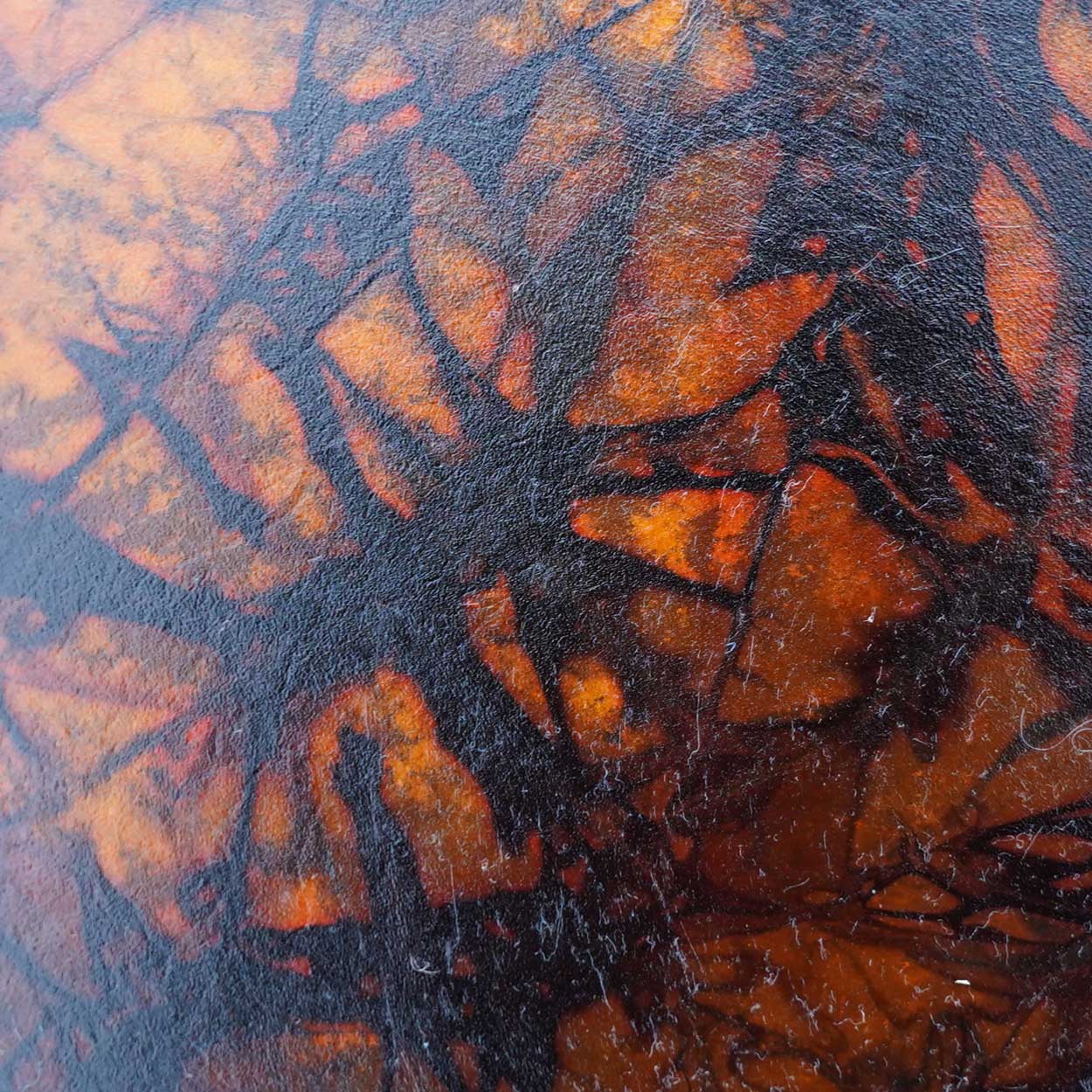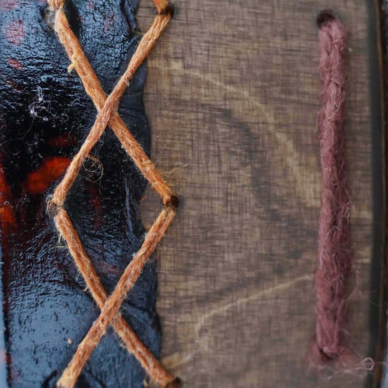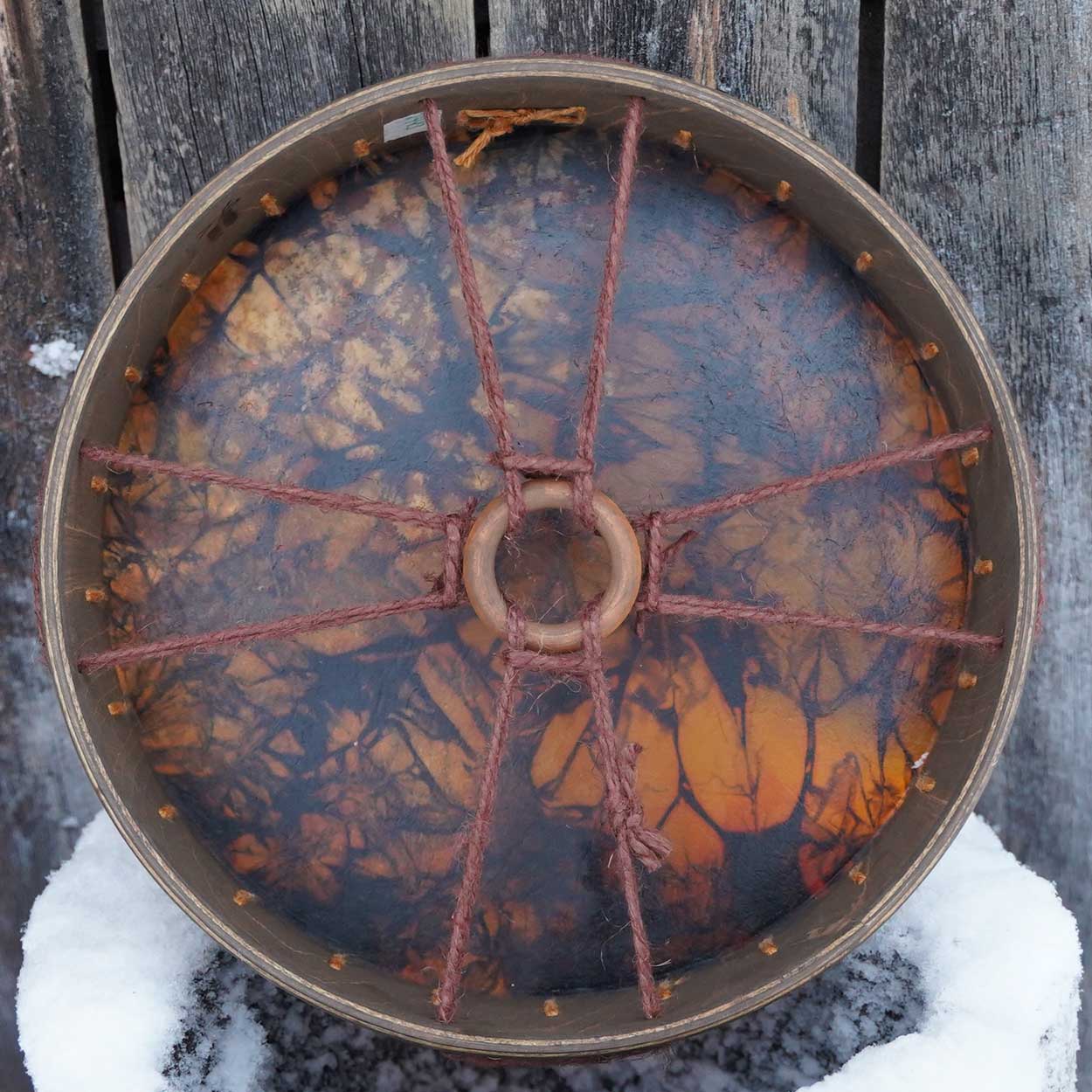 Luonto ja sen kunnioittaminen ovat meille tärkeitä. Siksi rummun materiaalit hankitaan pääosin paikallisilta, vastuullisilta tuottajilta. Runko on taivutettu kaksinkertaisesta koivuvanerista ja viimeistelty luonnollisella puuvahalla. Shamaanirummun kalvo on kotimaista poronnahkaa – joko luonnonsävyinen tai kauniisti vesipetsillä värjätty. Takana on pyöreä käsikahva, joka on kiinnitetty nyörein.
