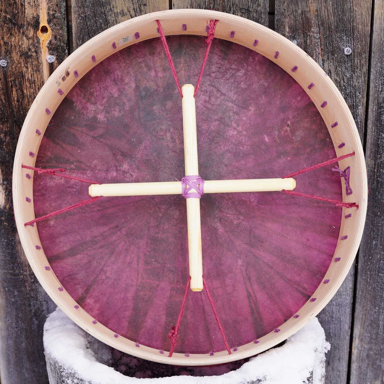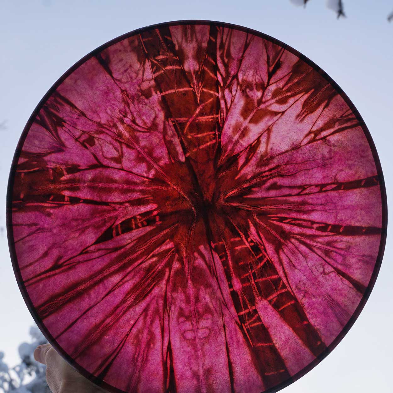 Luonto ja siitä huolenpitäminen on meille hyvin tärkeää, minkä vuoksi hankimme rummun materiaalit pääosin paikallisilta, vastuullisilta tuottajilta. Runko on taivutettu kaksinkertaisesta koivuvanerista, joka on vahattu puuvahalla. Shamaanirummun kalvo on kotimaista poronnahkaa, joka on natural tai värjätty upeisiin väreihin vesipetsillä. Rummun käsikahvana toimii puinen nyörein sidottu ristikko, josta saa hyvän soitto-otteen.
