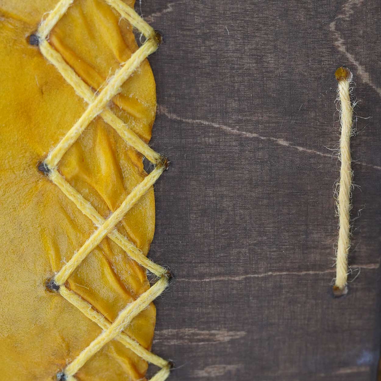 Materiaalit on valittu huolella, ekologisuus edellä. Runko on taivutettua, kaksinkertaista koivuvaneria ja viimeistelty luonnollisella puuvahalla. Kalvona on kotimainen poronnahka – natural tai vesipetsillä kauniisti värjätty. Kahva on kerätty Lapin luonnosta: käsin muotoiltu, kevyesti viimeistelty ja nyörein sidottu ristikoksi, joka istuu tukevasti käteen.