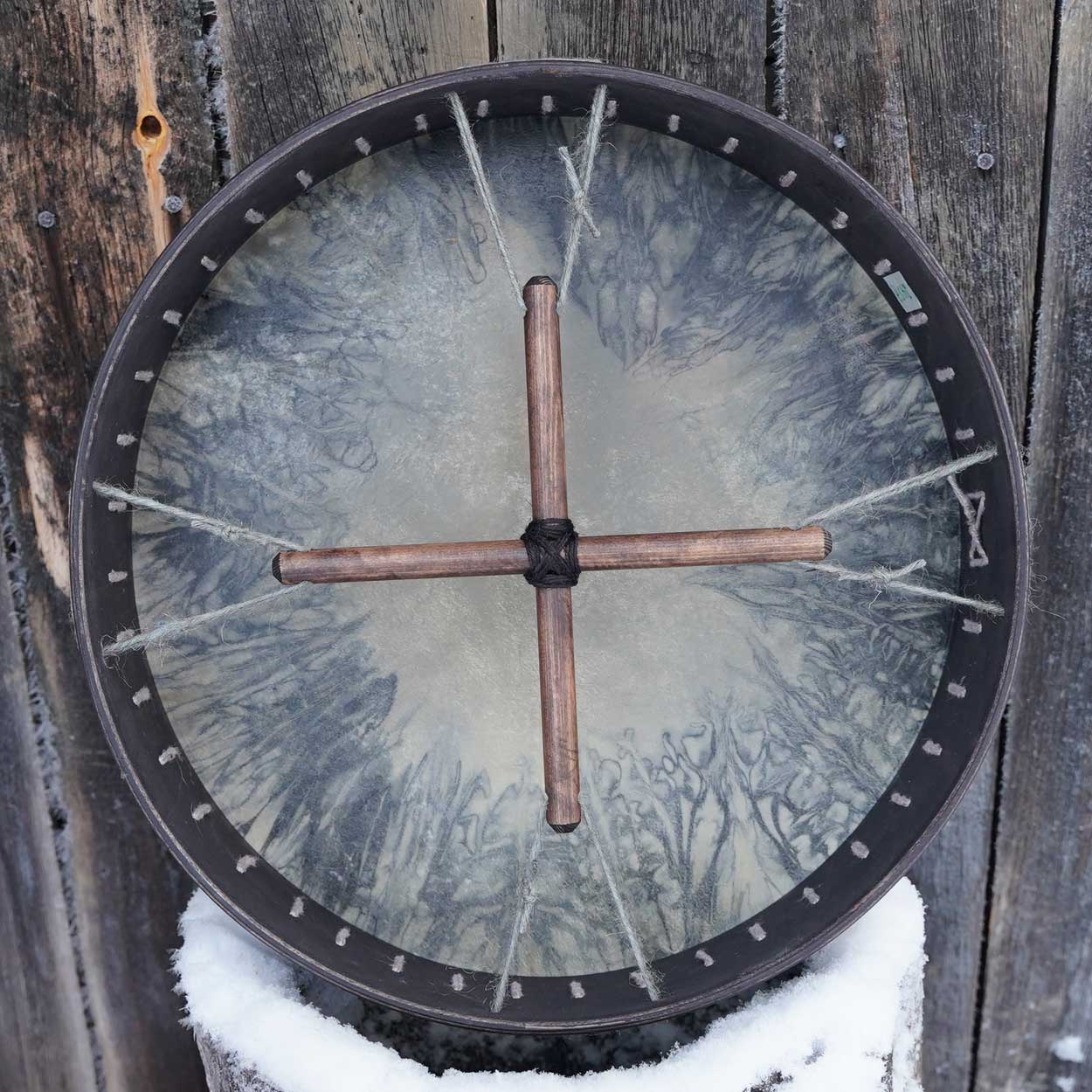 Näyttävä, keskikokoinen shamaanirumpu on valmistettu huolella käsityönä työpajasamme Lapissa. M-kokoinen rumpu sopii niin aloittelijan kuin kokeneemmankin rumpalin käteen. Rummun tumma ja kantava ääni tuntuu vatsanpohjassa asti, johdatellen kuulijat elävöittävään ja rentoutuneeseen tilaan.