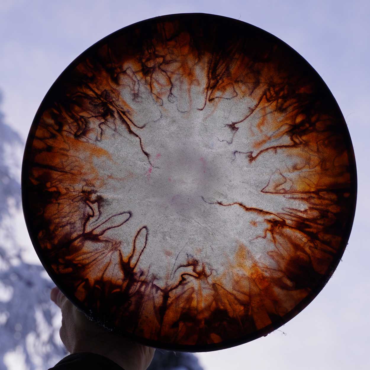 Luonto ja siitä huolenpitäminen on meille hyvin tärkeää, minkä vuoksi hankimme rummun materiaalit pääosin paikallisilta, vastuullisilta tuottajilta. Runko on taivutettu kaksinkertaisesta koivuvanerista, joka on vahattu puuvahalla. Shamaanirummun kalvo on kotimaista poronnahkaa, joka on natural tai värjätty upeisiin väreihin vesipetsillä. Pyöreä käsikahva on kiinnitetty rummun taakse nyörein.