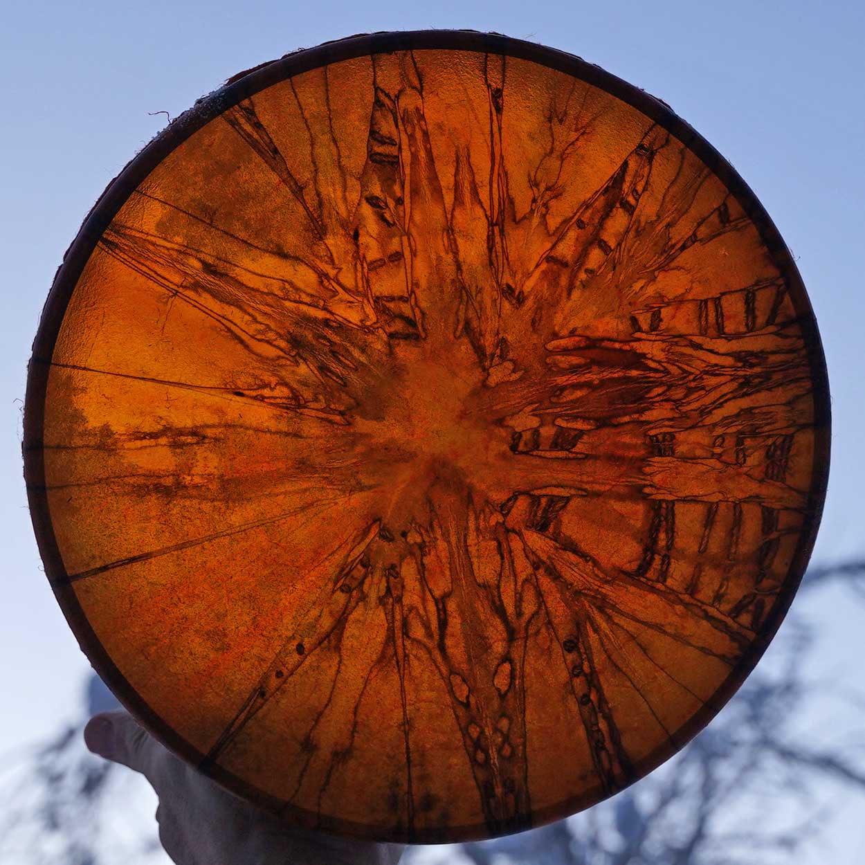 Luonto ja sen kunnioittaminen ovat meille tärkeitä. Siksi rummun materiaalit hankitaan pääosin paikallisilta, vastuullisilta tuottajilta. Runko on taivutettu kaksinkertaisesta koivuvanerista ja viimeistelty luonnollisella puuvahalla. Shamaanirummun kalvo on kotimaista poronnahkaa – joko luonnonsävyinen tai kauniisti vesipetsillä värjätty. Takana on pyöreä käsikahva, joka on kiinnitetty nyörein.