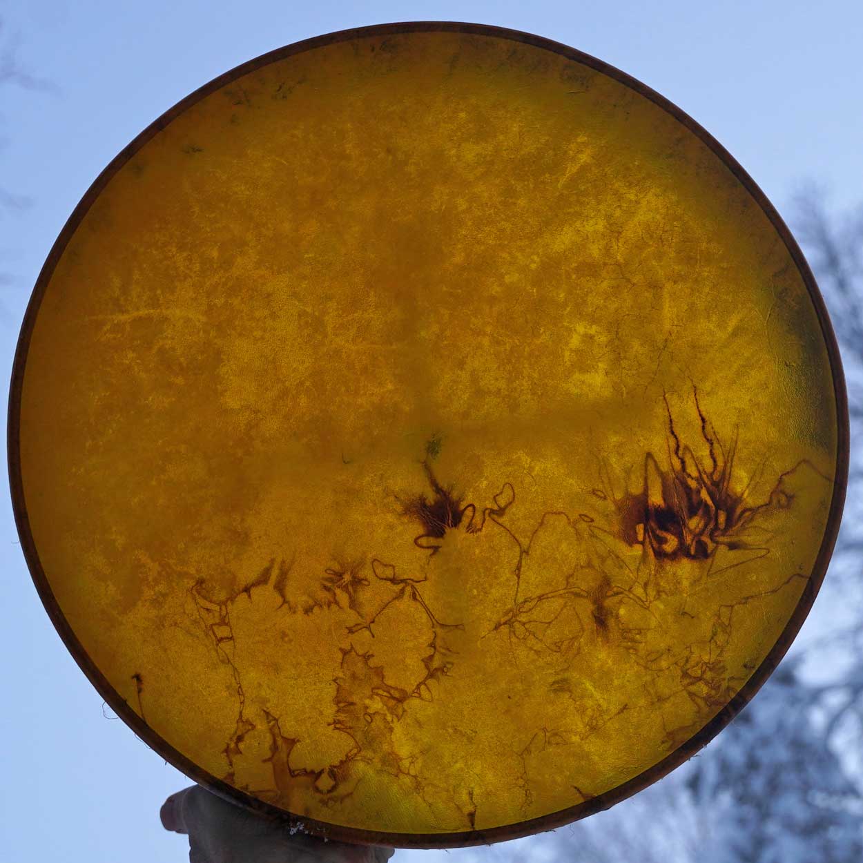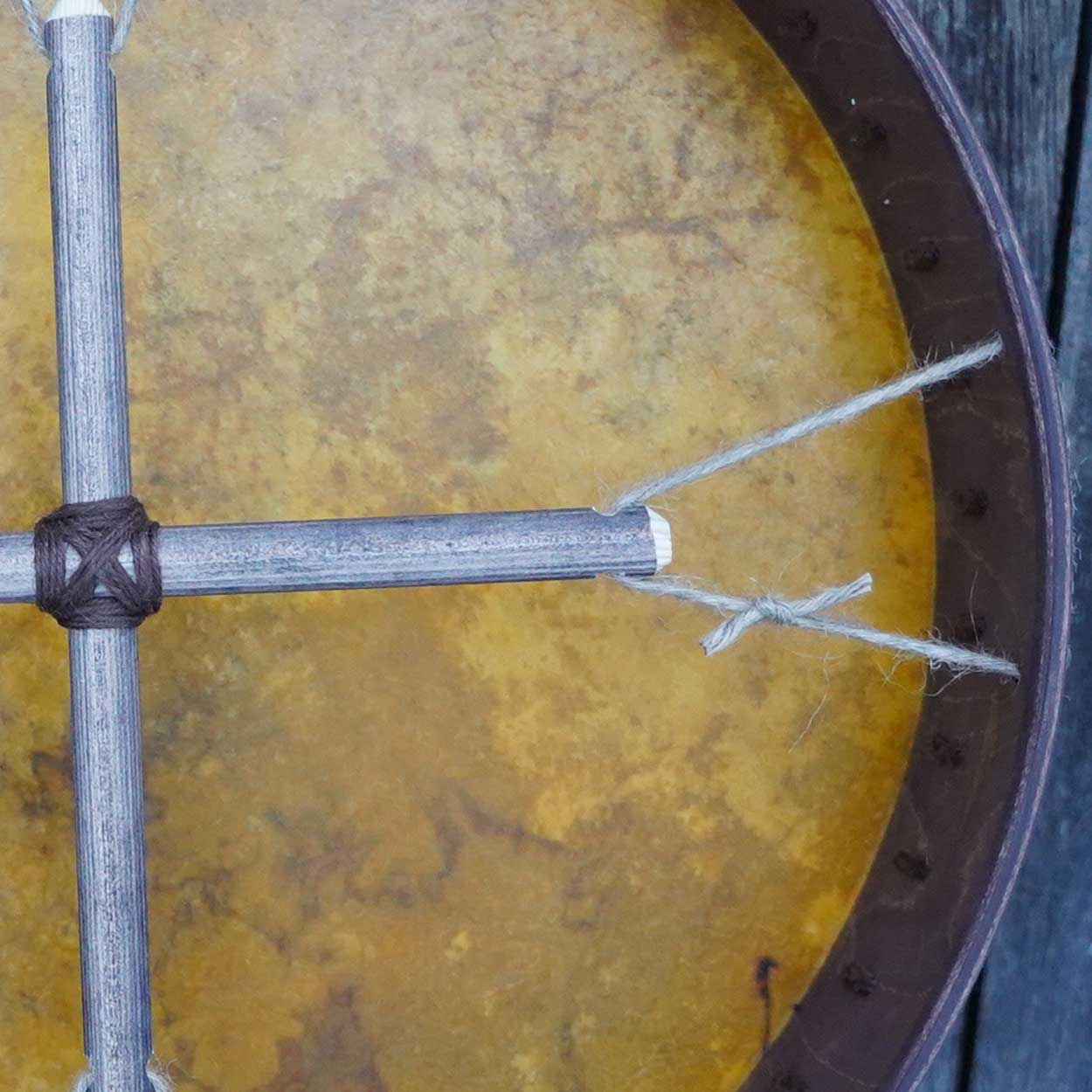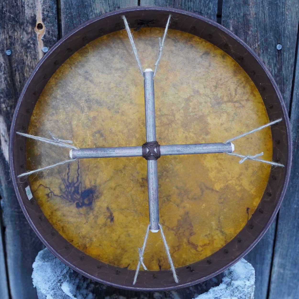 Näyttävä, keskikokoinen shamaanirumpu on valmistettu huolella käsityönä työpajasamme Lapissa. M-kokoinen rumpu sopii niin aloittelijan kuin kokeneemmankin rumpalin käteen. Rummun tumma ja kantava ääni tuntuu vatsanpohjassa asti, johdatellen kuulijat elävöittävään ja rentoutuneeseen tilaan.