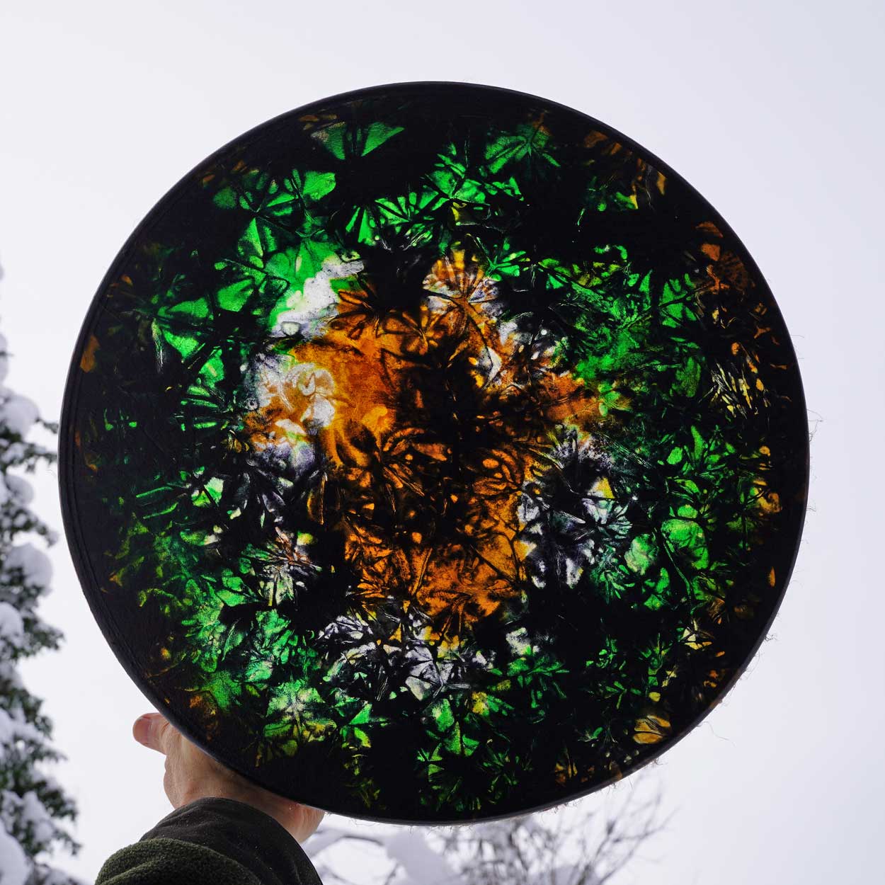 Luonto ja siitä huolenpitäminen on meille hyvin tärkeää, minkä vuoksi hankimme rummun materiaalit pääosin paikallisilta, vastuullisilta tuottajilta. Runko on taivutettu kaksinkertaisesta koivuvanerista, joka on vahattu puuvahalla. Shamaanirummun kalvo on kotimaista poronnahkaa, joka on natural tai värjätty upeisiin väreihin vesipetsillä. Rummun käsikahvana toimii puinen nyörein sidottu ristikko, josta saa hyvän soitto-otteen.