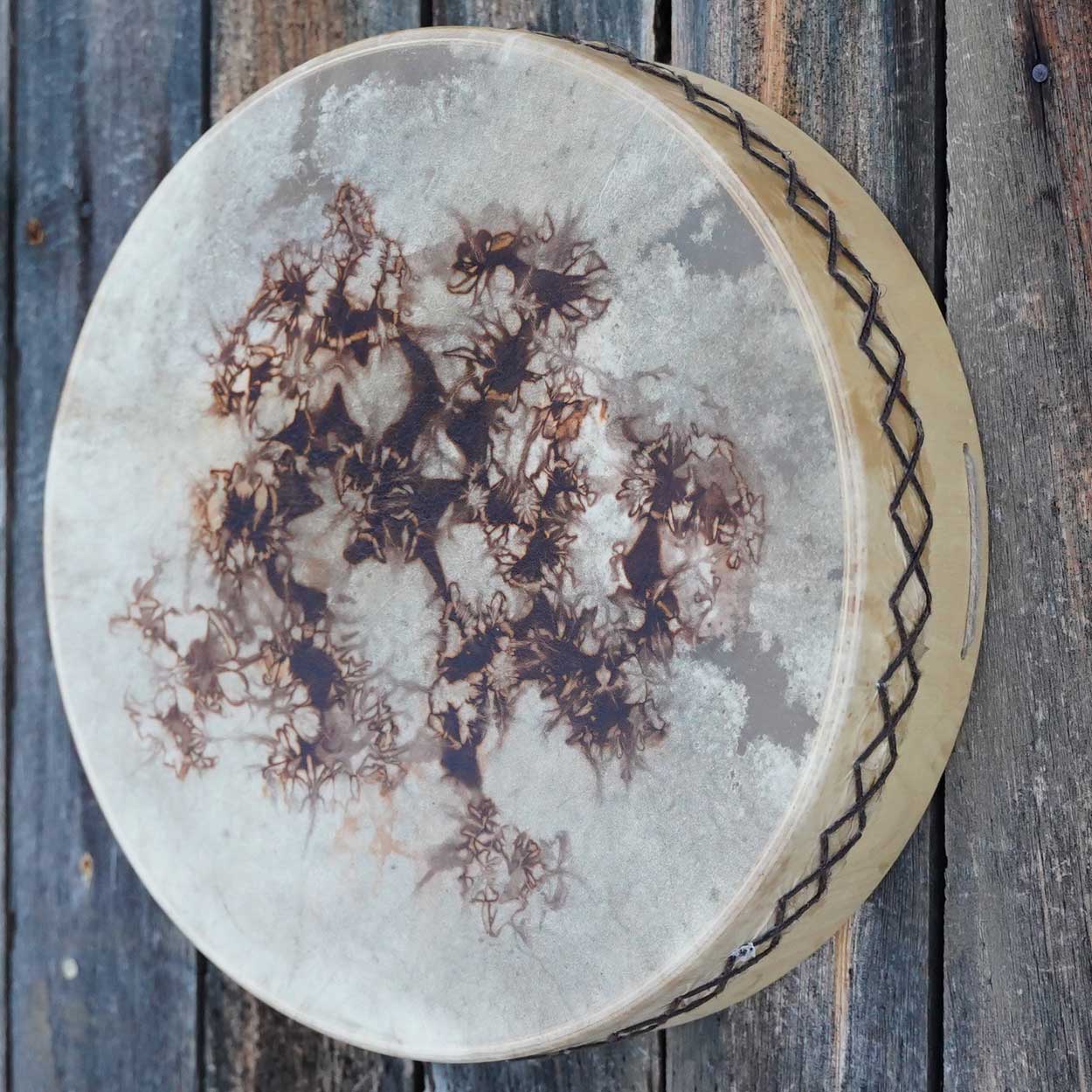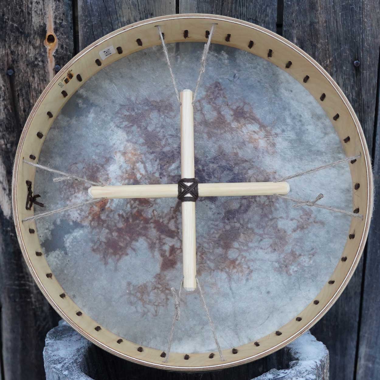 Näyttävä, keskikokoinen shamaanirumpu on valmistettu huolella käsityönä työpajasamme Lapissa. M-kokoinen rumpu sopii niin aloittelijan kuin kokeneemmankin rumpalin käteen. Rummun tumma ja kantava ääni tuntuu vatsanpohjassa asti, johdatellen kuulijat elävöittävään ja rentoutuneeseen tilaan.