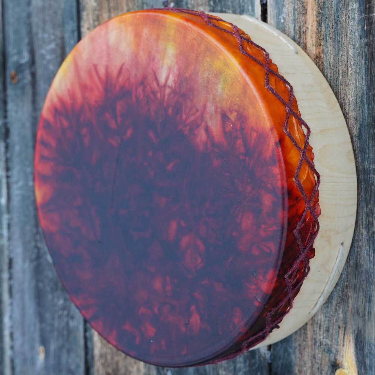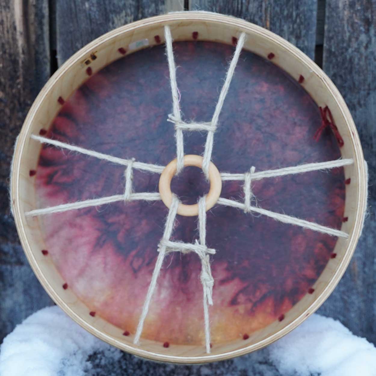 Luonto ja sen kunnioittaminen ovat meille tärkeitä. Siksi rummun materiaalit hankitaan pääosin paikallisilta, vastuullisilta tuottajilta. Runko on taivutettu kaksinkertaisesta koivuvanerista ja viimeistelty luonnollisella puuvahalla. Shamaanirummun kalvo on kotimaista poronnahkaa – joko luonnonsävyinen tai kauniisti vesipetsillä värjätty. Takana on pyöreä käsikahva, joka on kiinnitetty nyörein.