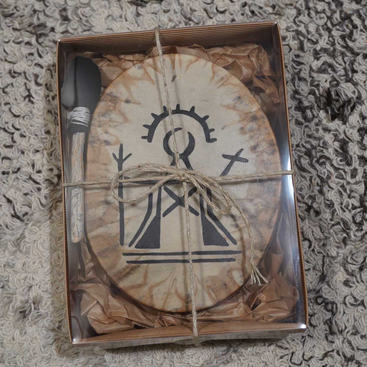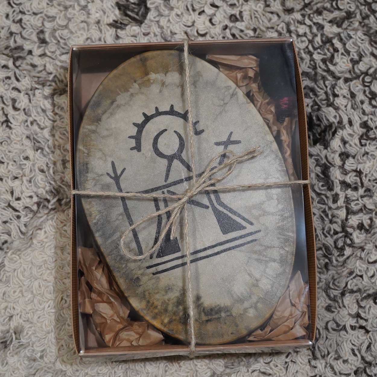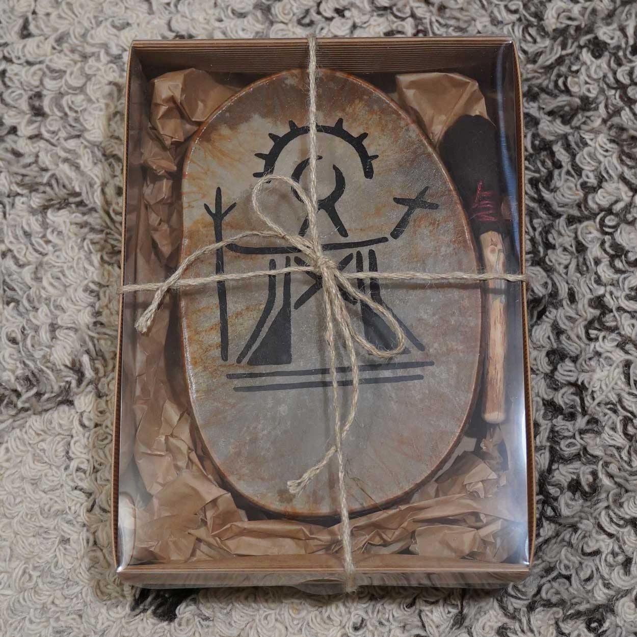 Luonto ja siitä huolenpitäminen on meille hyvin tärkeää, minkä vuoksi hankimme rummun materiaalit pääosin paikallisilta, vastuullisilta tuottajilta. Runko on taivutettu kaksinkertaisesta koivuvanerista, joka on vahattu puuvahalla. Shamaanirummun kalvo on kotimaista poronnahkaa, joka on natural tai värjätty upeisiin väreihin vesipetsillä. Pyöreä käsikahva on kiinnitetty rummun taakse nyörein. Rummun mukana seuraavat printatut hoito-ohjeet. Vihkimisohjeet voit ladata tästä.Lahjakortti – Shamaanirumpu M-kokoinen, sis. postikulut