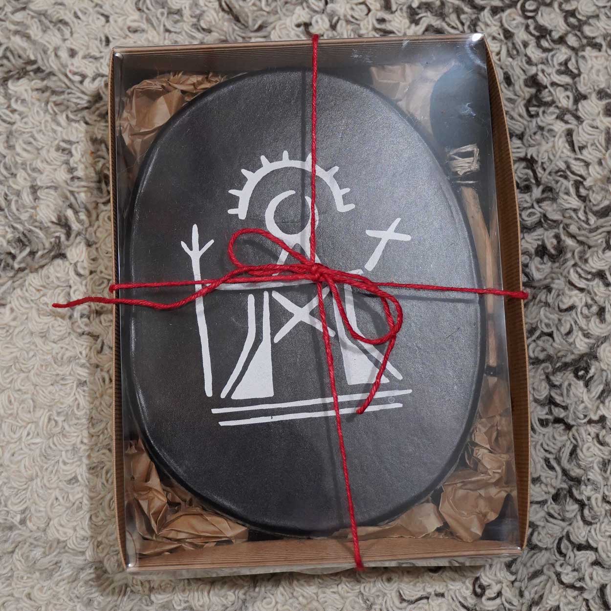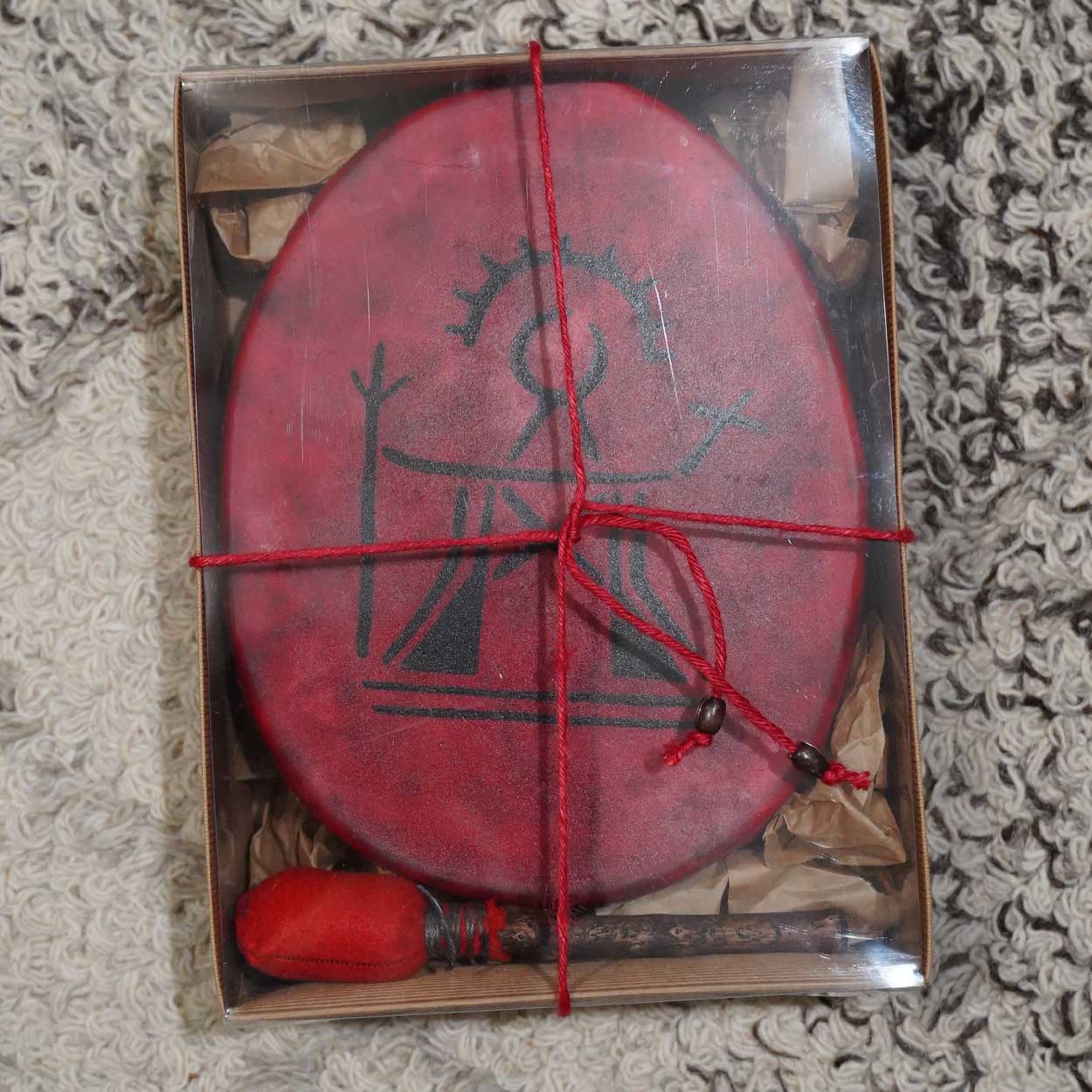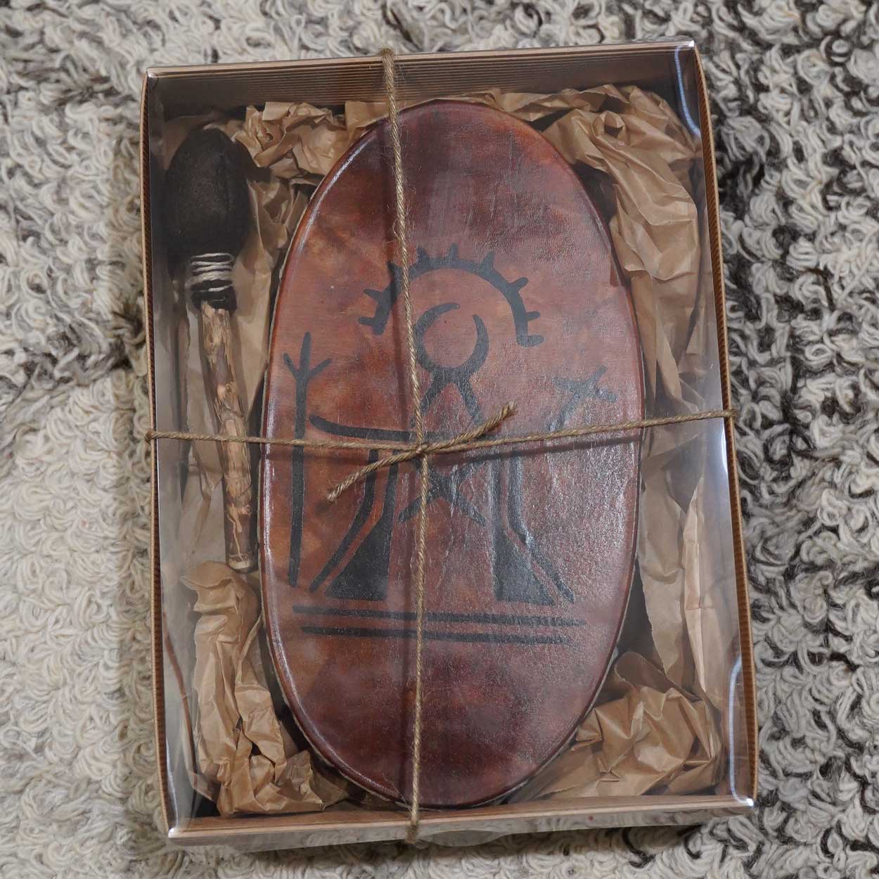 Upeat, uniikit koristerummut nyt Lapin ystävälle! Käsintehdyissä matkamuistoissa on Ukkosenjumala Tiermes silkkipainokuvana. Kalvo aitoa suomalaista poronnahkaa. Kehikko on 2-4 mm paksuista puuvahalla värjättyä koivuvaneria ja koko noin 29×20 cm. Kehikko ei ole “täydellisen” muotoinen, vaan käsin tehdyn näköinen. Valmistettu Savukoskella.