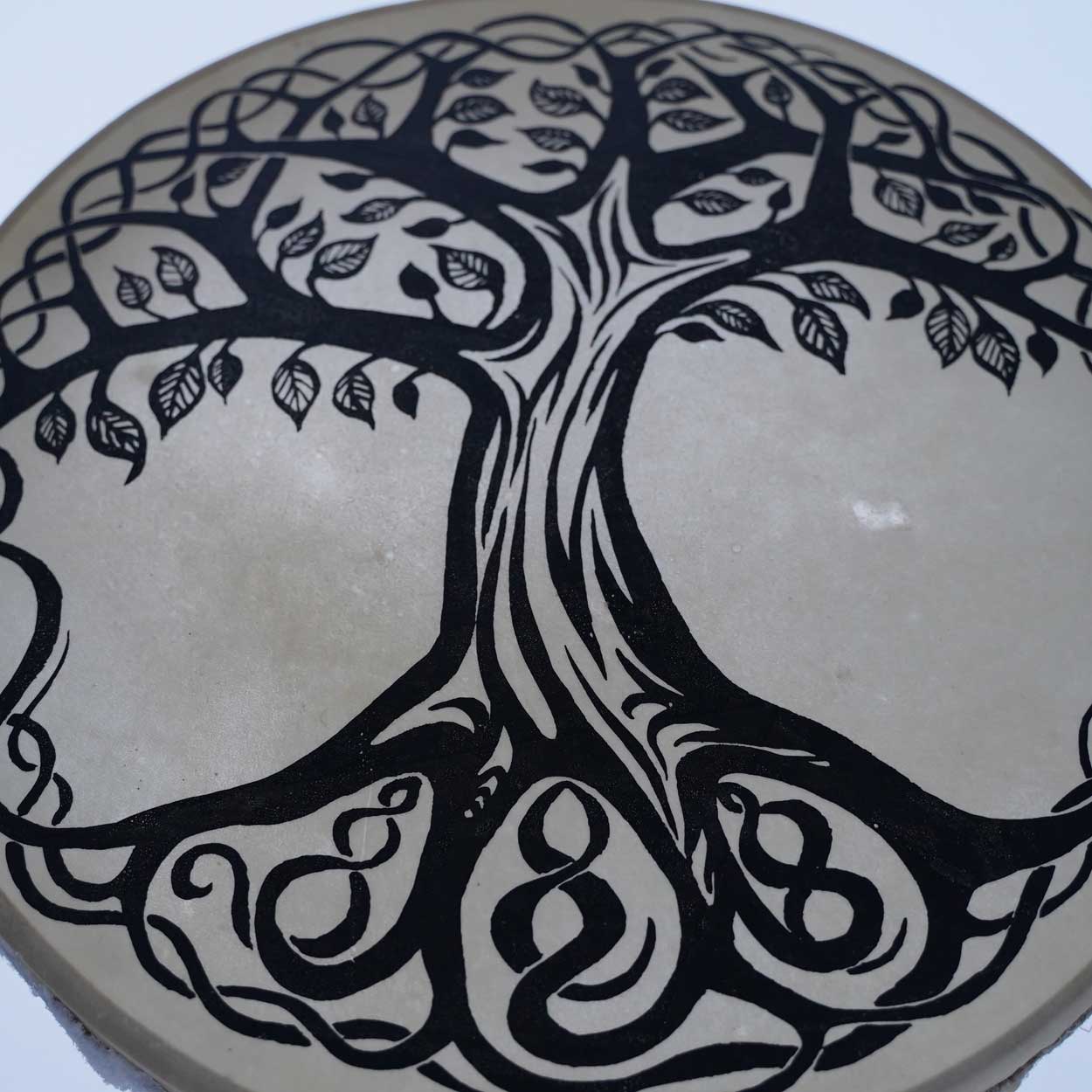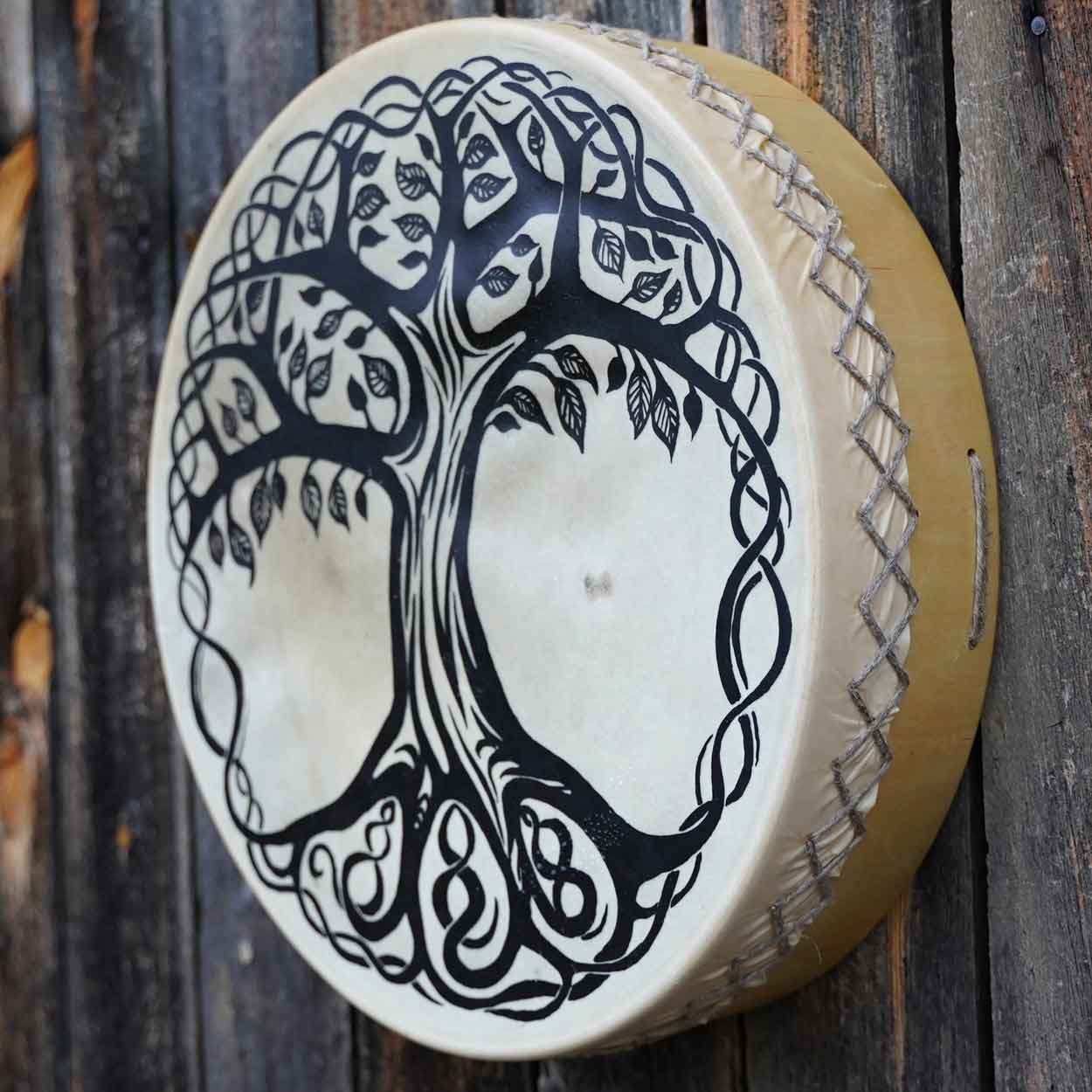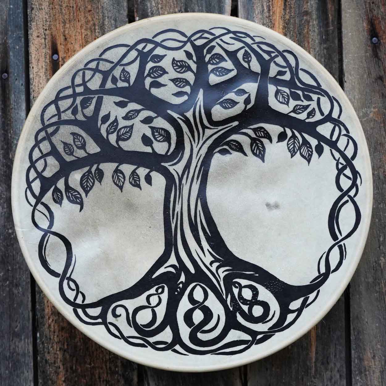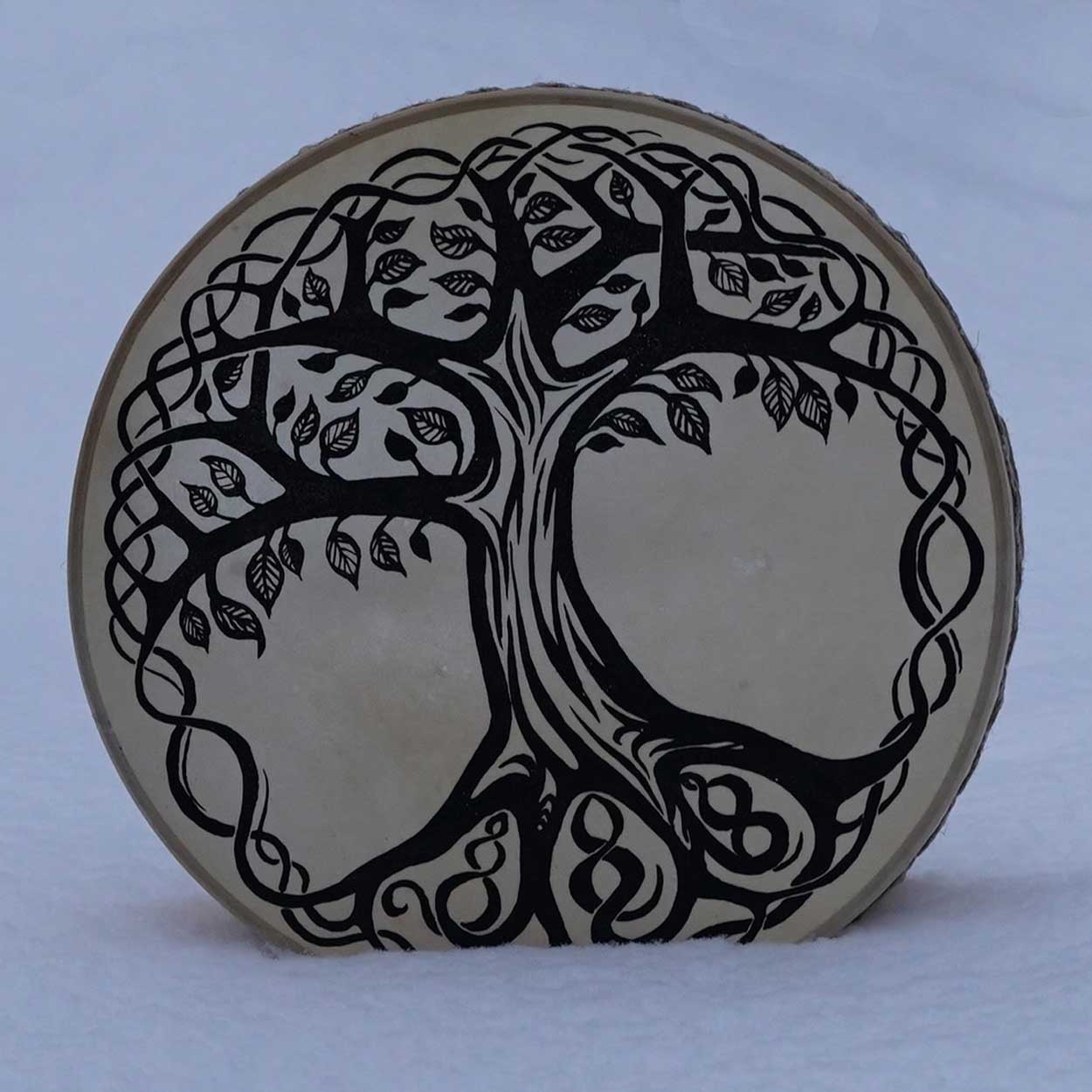 Viikinkirumpu Elämänpuu Yggdrasil on suomalaista, uniikkia käsityötä. Rumpu on monikäyttöinen soitin, joka passaa soittamisen lisäksi meditointiin, hoitoihin tai vaikkapa luomaan tunnelmaan ja mystiikkaa sisustukseen.