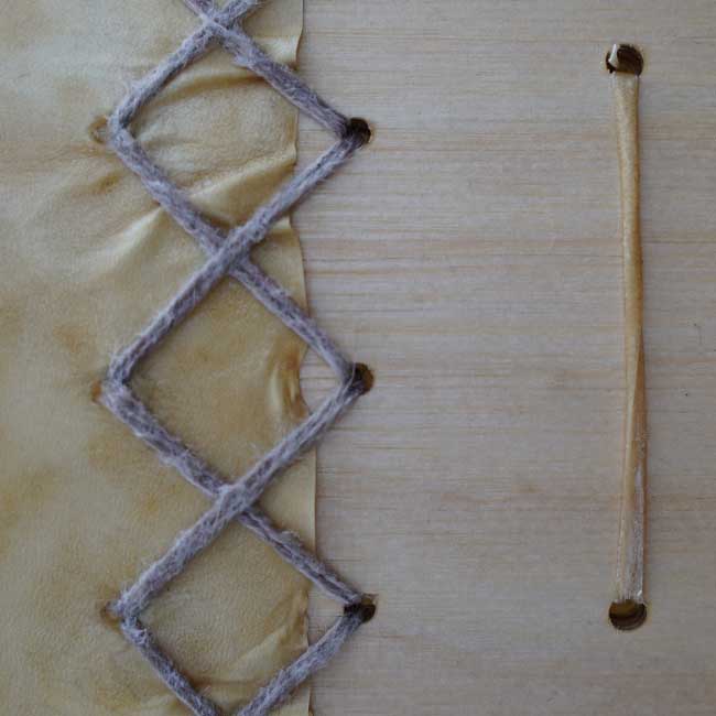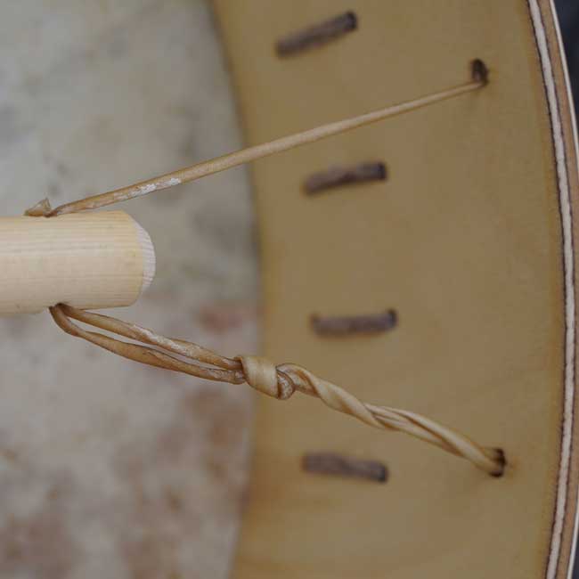 Jokainen voimeläinrumpu on ulkomuodoltaan yksilöllinen. Käsikahva on kiinnitetty rummun taakse nyörein.