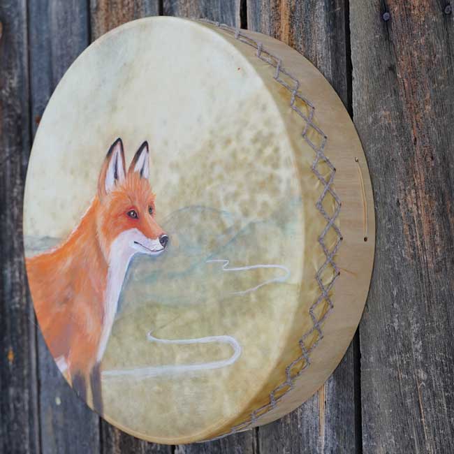 Voimaeläinrummussa komeilee taiteilijan käsin piirtämä voimaeläin, kettu. Tuo kaunis, punaruskea, nelijalkainen ystävämme tuo voimaeläimenä elämääsi mm. selkeyttä. Voimaläinrumpu on monikäyttöinen tuote, joka sopii soittamisen lisäksi mm. meditointiin, äänihoitoon, sisustukseen ja henkisen polun tueksi.